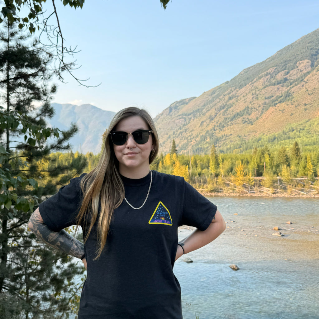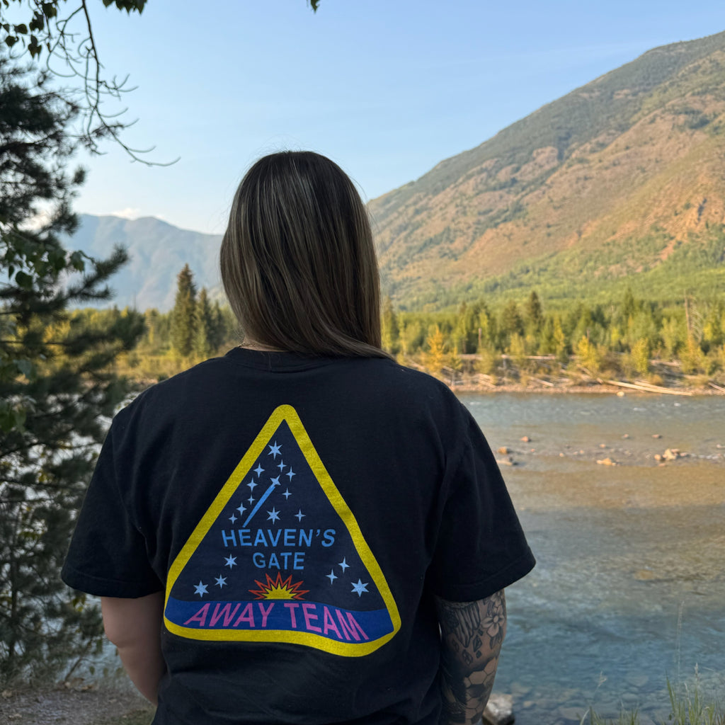 This bold graphic tee draws inspiration from one of the most infamous pieces of 1990s pop-culture history: Heaven’s Gate, the religious cult led by Marshall Applewhite. The design reimagines the group’s well-known “Away Team” patch in a bright, retro sci-fi style, turning a dark chapter in American history into a reflective, conversation-starting piece of apparel.