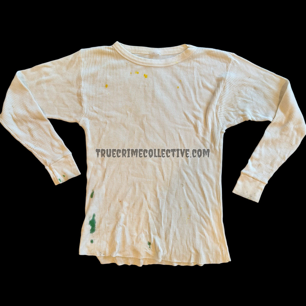 Charles Manson’s personally owned and worn thermal winter shirt, worn during his time at Corcoran State Prison. Manson clearly used this shirt while painting, as there are random splatters of paint on it from his art projects.