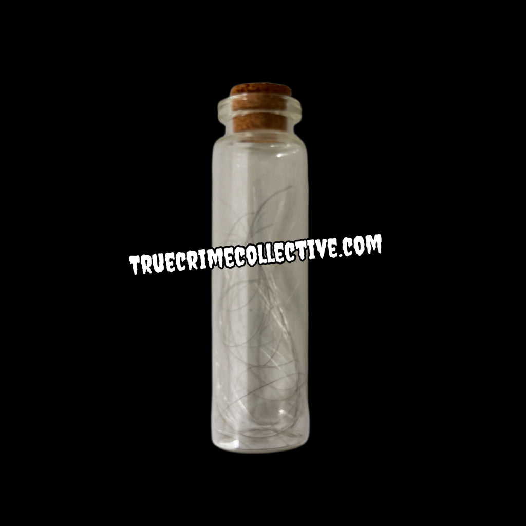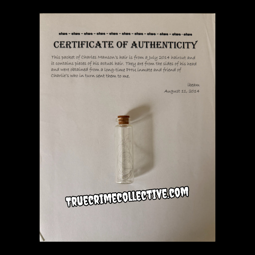 This is a small glass tube that is filled with Charles Manson’s hair, cut during a prison haircut in July of 2014. A COA from the original obtainer of this hair sample is included with the purchase of Manson’s hair.