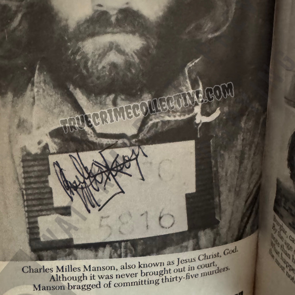 Unlike standard signed books, this volume contains page-by-page reactions from Manson himself, where he challenges, denies, and rewrites the narrative of the Manson Family murders in his own words. Each inscription provides chilling insight into his mindset, paranoia, and obsession with controlling how history would remember him.