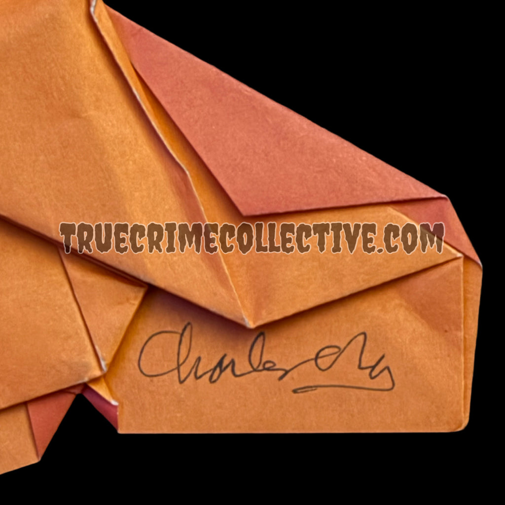 Origami butterfly made by California Serial Killer, Charles Ng. The origami was made with orange paper and signed on the outside of one of the folds. A very unique item!