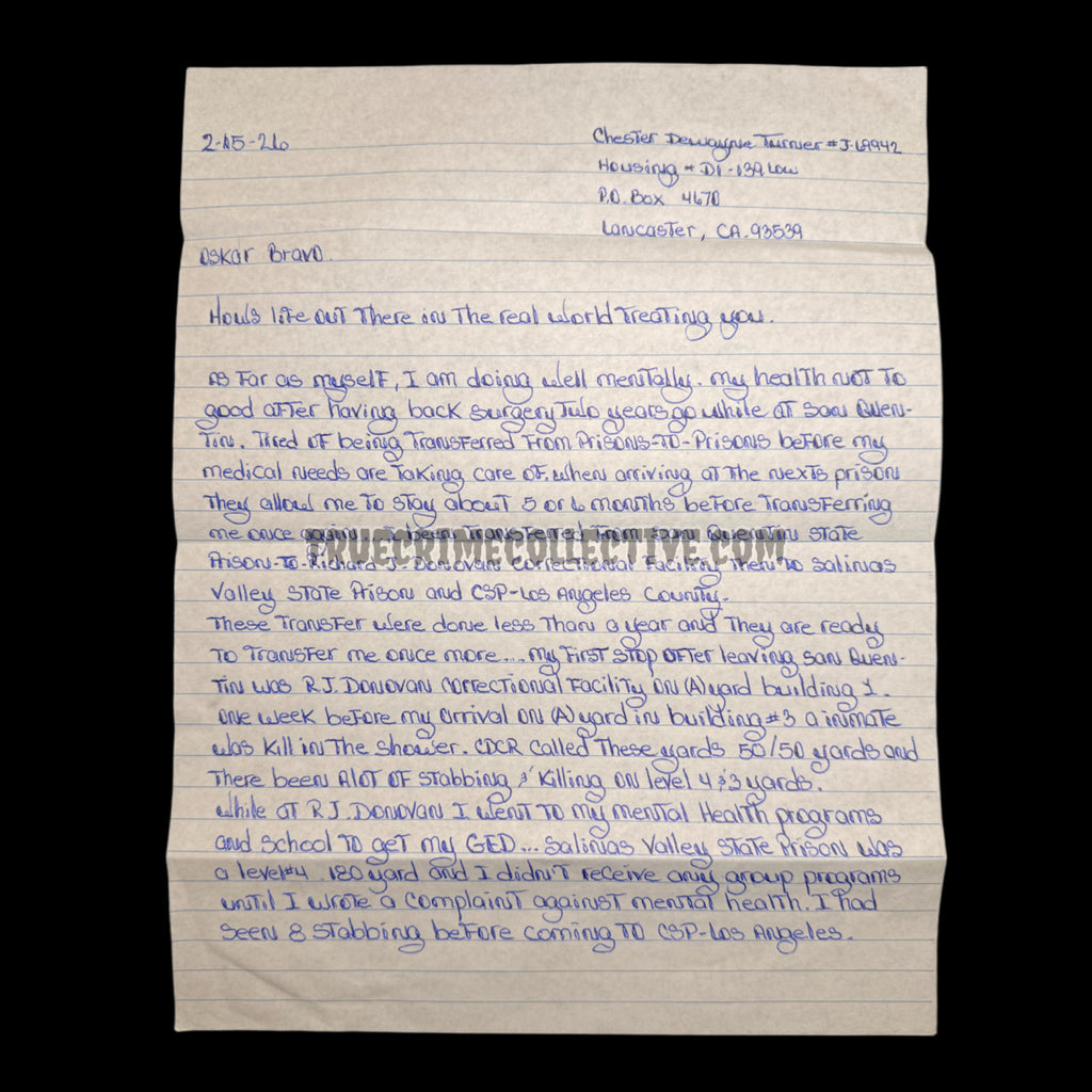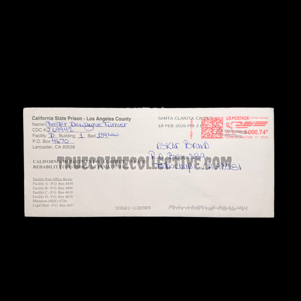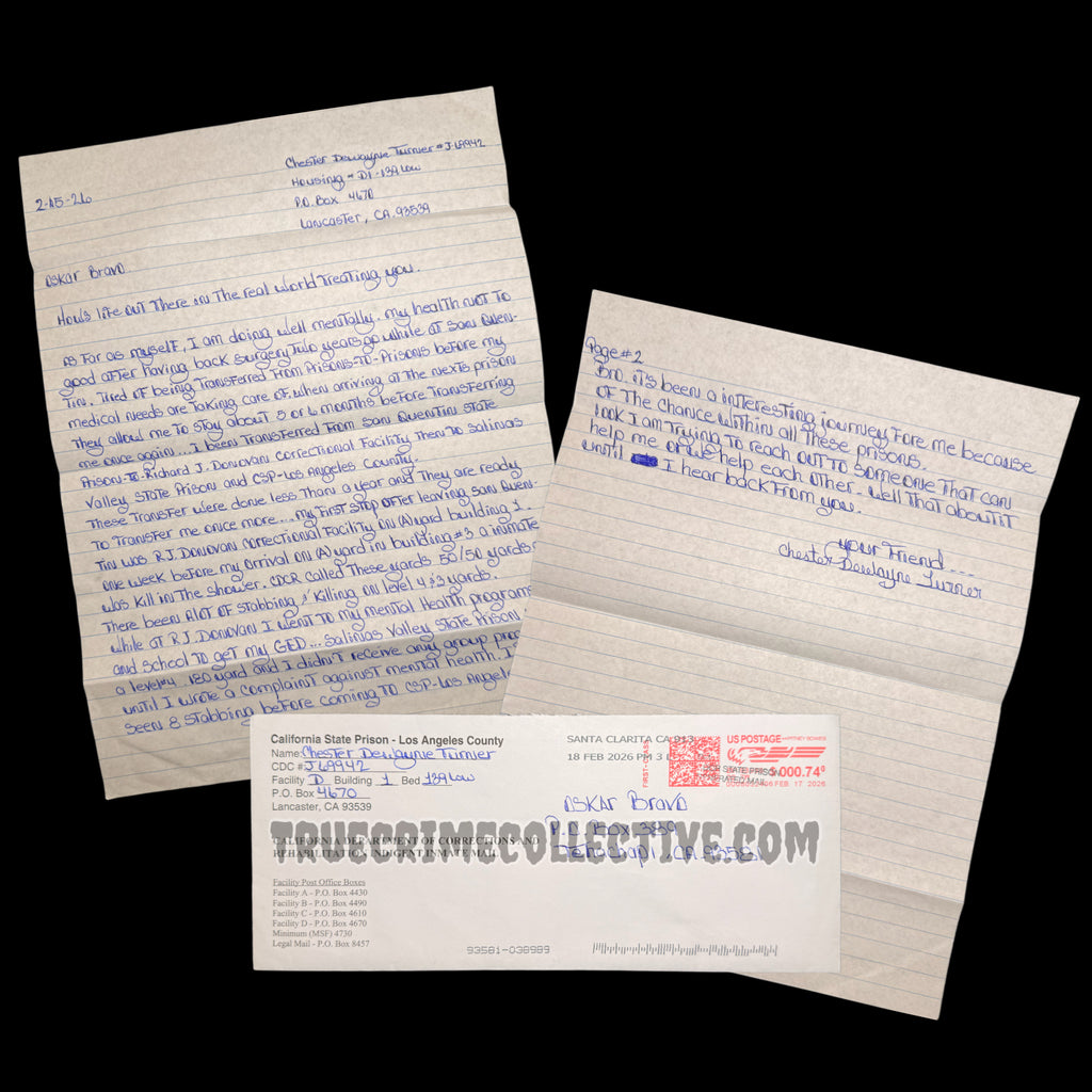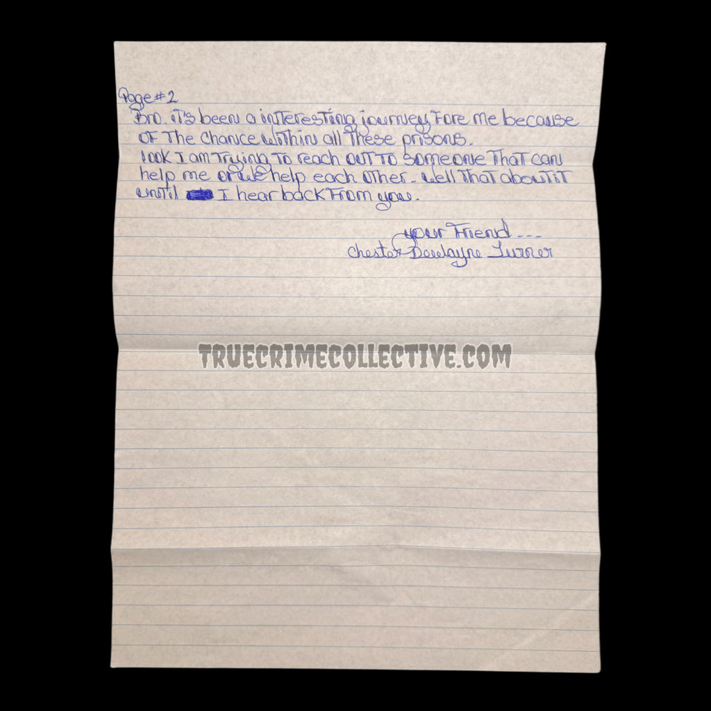 This original handwritten letter was authored by convicted serial killer Chester Dewayne Turner, who is responsible for one of the largest series of solved serial murders in the history of Los Angeles. Turner was convicted of multiple murders committed between the late 1980s and early 2000s, many of which remained unsolved for years before advances in DNA evidence linked him to the crimes.