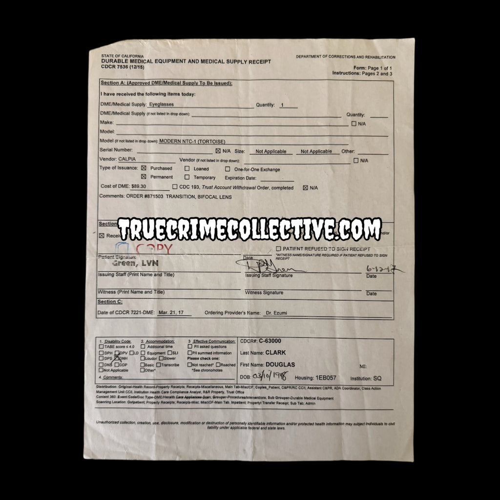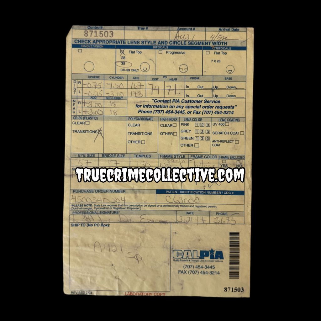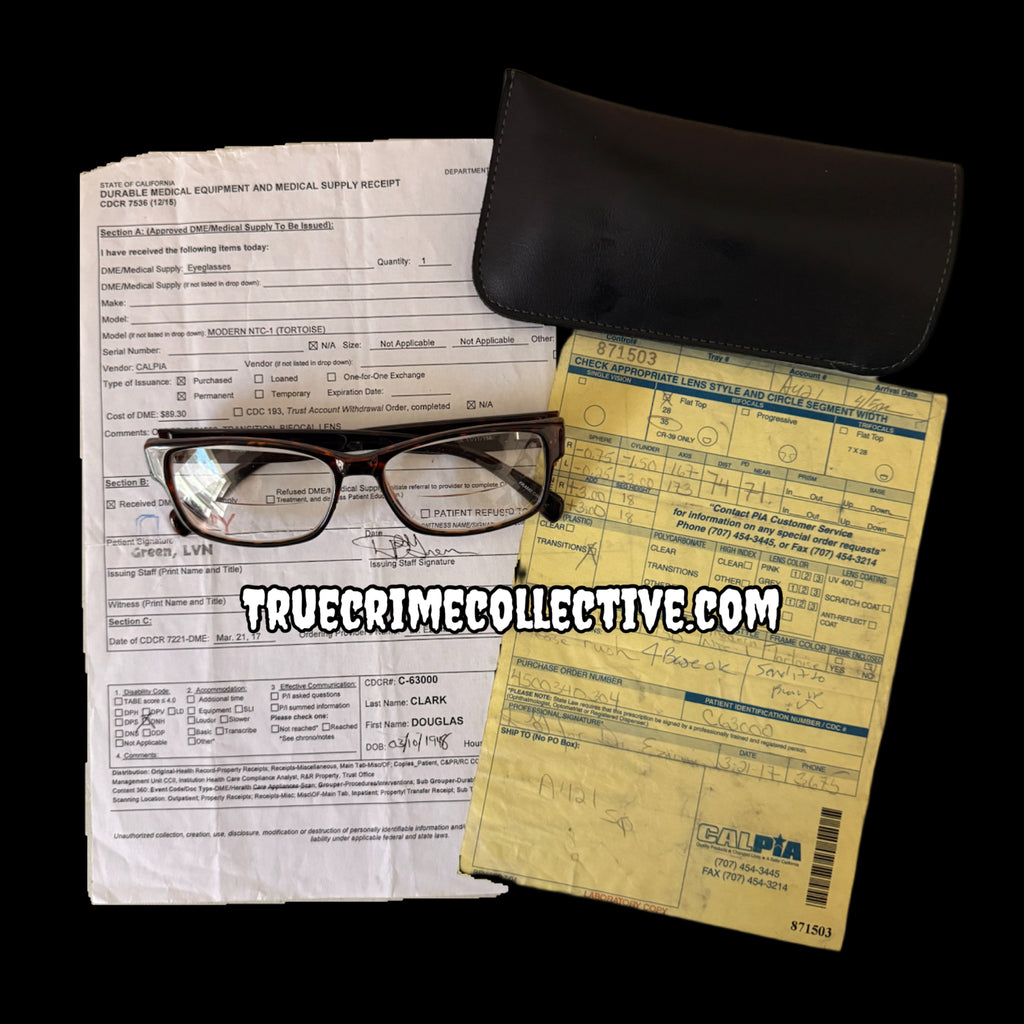 Serial killer Douglas Clark’s prison owned prescription glasses. These come with the original case as well as the prescription for the lenses and the DOC medical supply receipt to prove provenance and authenticity.