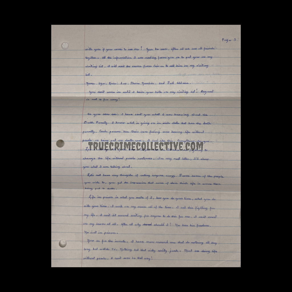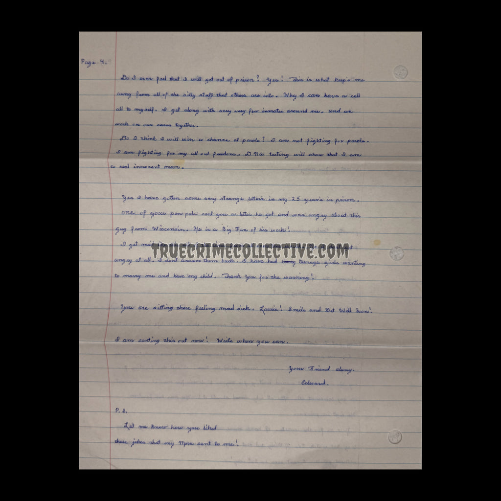 Handwritten letter and short story from member of the Chicago Ripper Crew, Edward Spreitzer. The letter has been hand signed by Ed, and the mailing envelope has his full handwritten signature as well. The letter is four pages and includes another two page short story along with it.