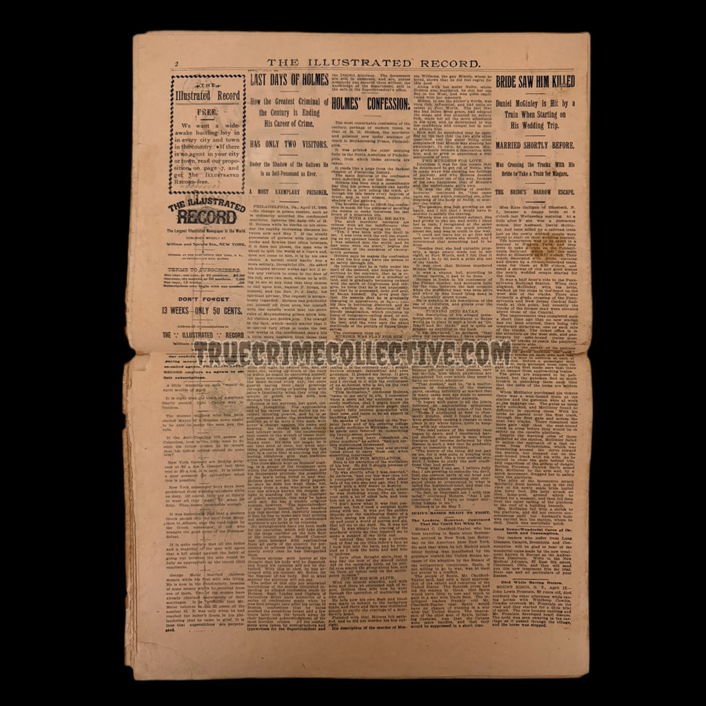 This rare antique newspaper features a striking front-page headline focused on H.H. Holmes, one of America’s earliest and most notorious serial killers. Published during the height of national fascination with the Holmes case, the paper details his final days, confessions, crimes, and public reaction, capturing true crime history as it unfolded in real time. Printed in the late 19th century, this original period newspaper offers authentic insight into how the media portrayed Holmes, his murders, and the broader cultural shock surrounding the “Murder Castle” revelations.