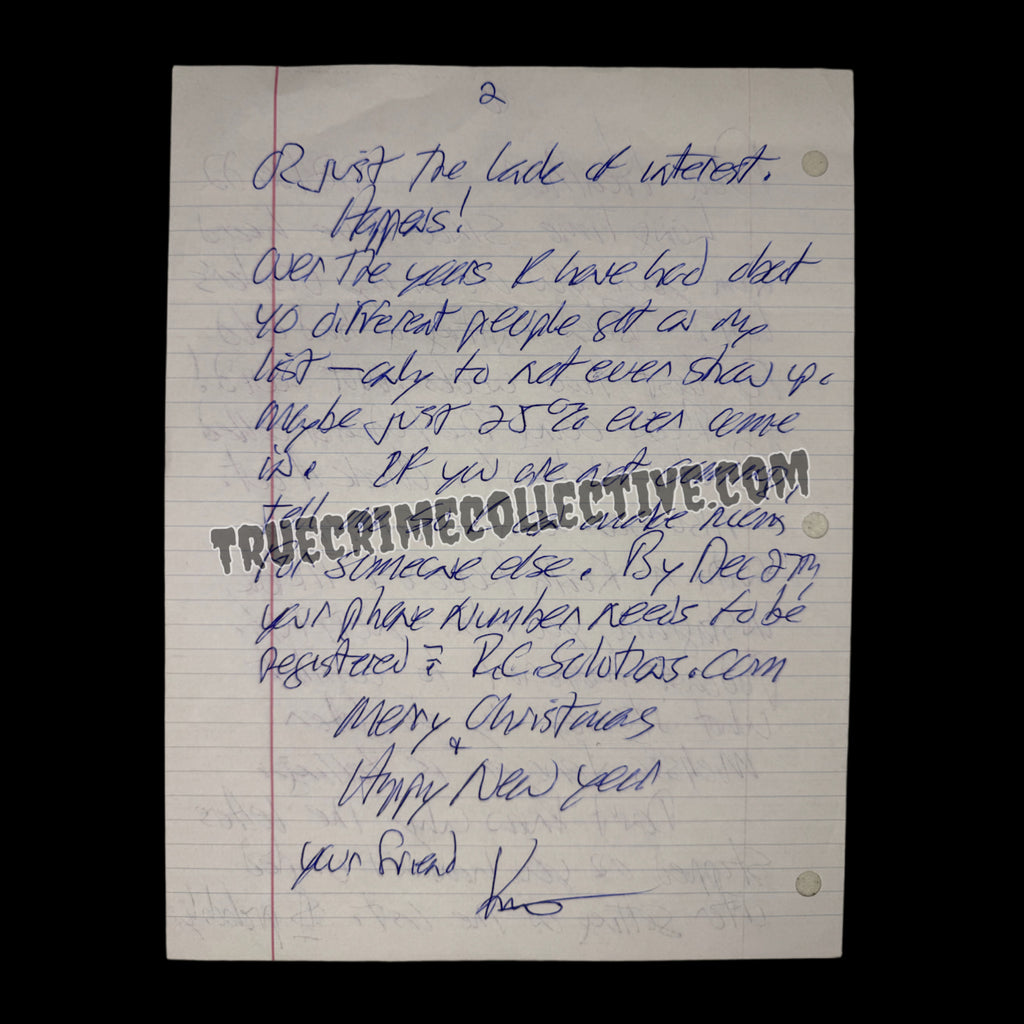 Two page handwritten letter and envelope from the Happy Face Killer, Keith Hunter Jesperson. The envelope has been signed with his full name, and he signed “Keith” at the end of the letter.