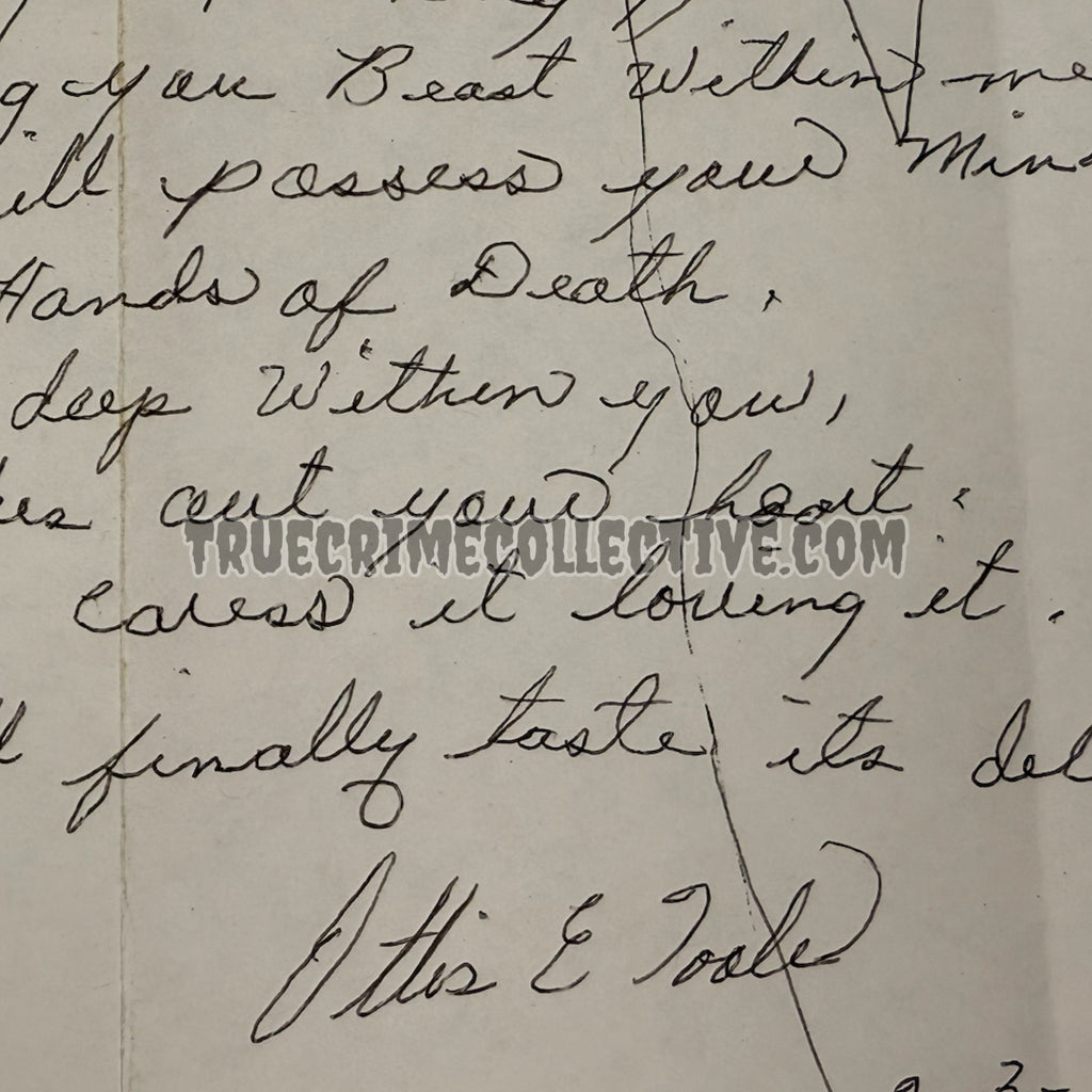 This is an extremely rare, one of a kind item from serial killer Ottis Toole. The item consists of Ottis’ left and right hand tracings, and a poem he wrote about his “hands of death.” The poem speaks about his hands reaching out, taking your life, and ripping out your heart to eat. Toole signed this twice and also dated it. One of the most significant things about this piece is the title “Hands of Death,” as this is the satanic cult that Toole and his partner in crime Henry Lee Lucas claimed to be a part of.