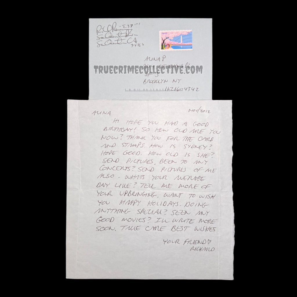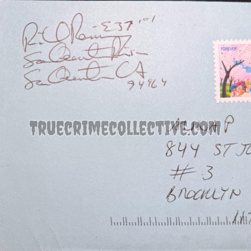 The letter is handwritten entirely in Ramirez’s hand, offering direct insight into his tone, phrasing, and personality during incarceration. The accompanying envelope bears his signature and institutional mailing details, adding historical authenticity and collector value. Together, the letter and envelope form a complete archival pairing, preserving both content and original transmission context.
