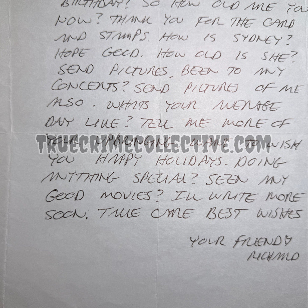 Known as the “Night Stalker,” Ramirez was convicted in connection with a series of highly publicized crimes in California during the 1980s. During his incarceration, he maintained written communication with select correspondents, and surviving examples of complete letters with original mailing envelopes remain highly sought after within established true crime and criminal history collecting circles.