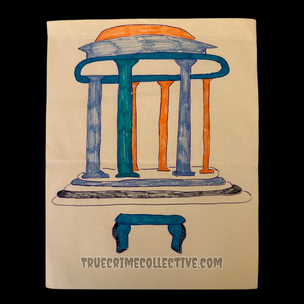 This is a two page signed letter from the Night Stalker, Richard Ramirez. Included with this handwritten letter is a marker drawing of what appears to be a Roman Temple with a bench in front of it. The drawing is unsigned. Accompanied with this letter and drawing is the original mailing envelope which has been signed in full by Ramirez.