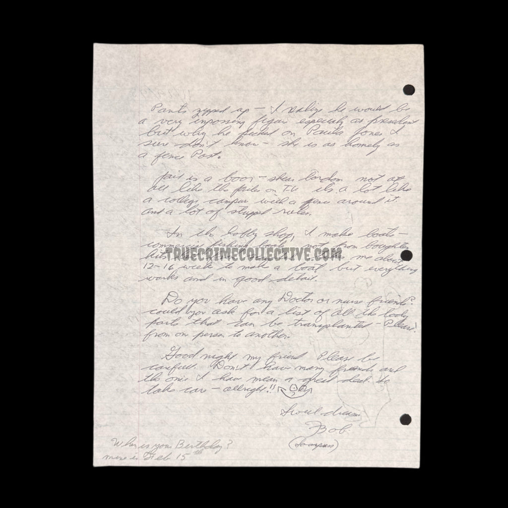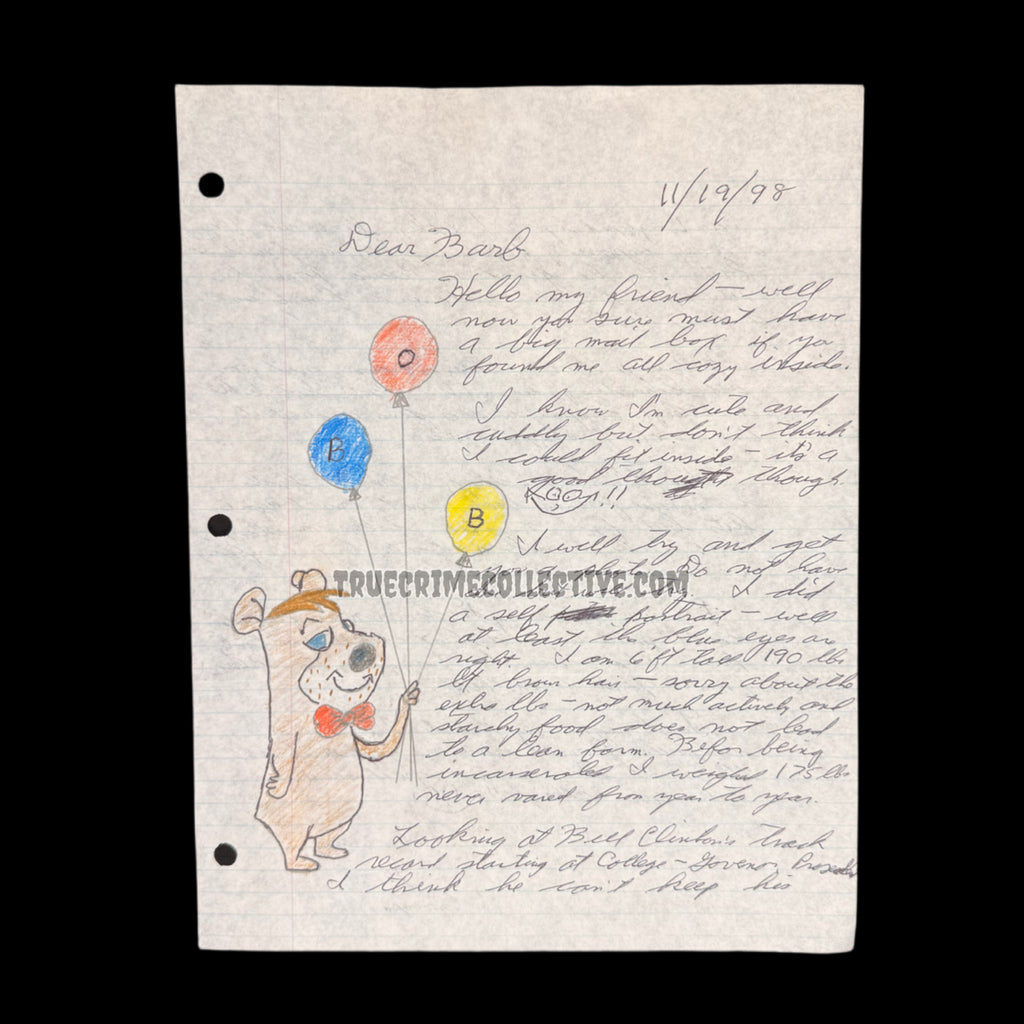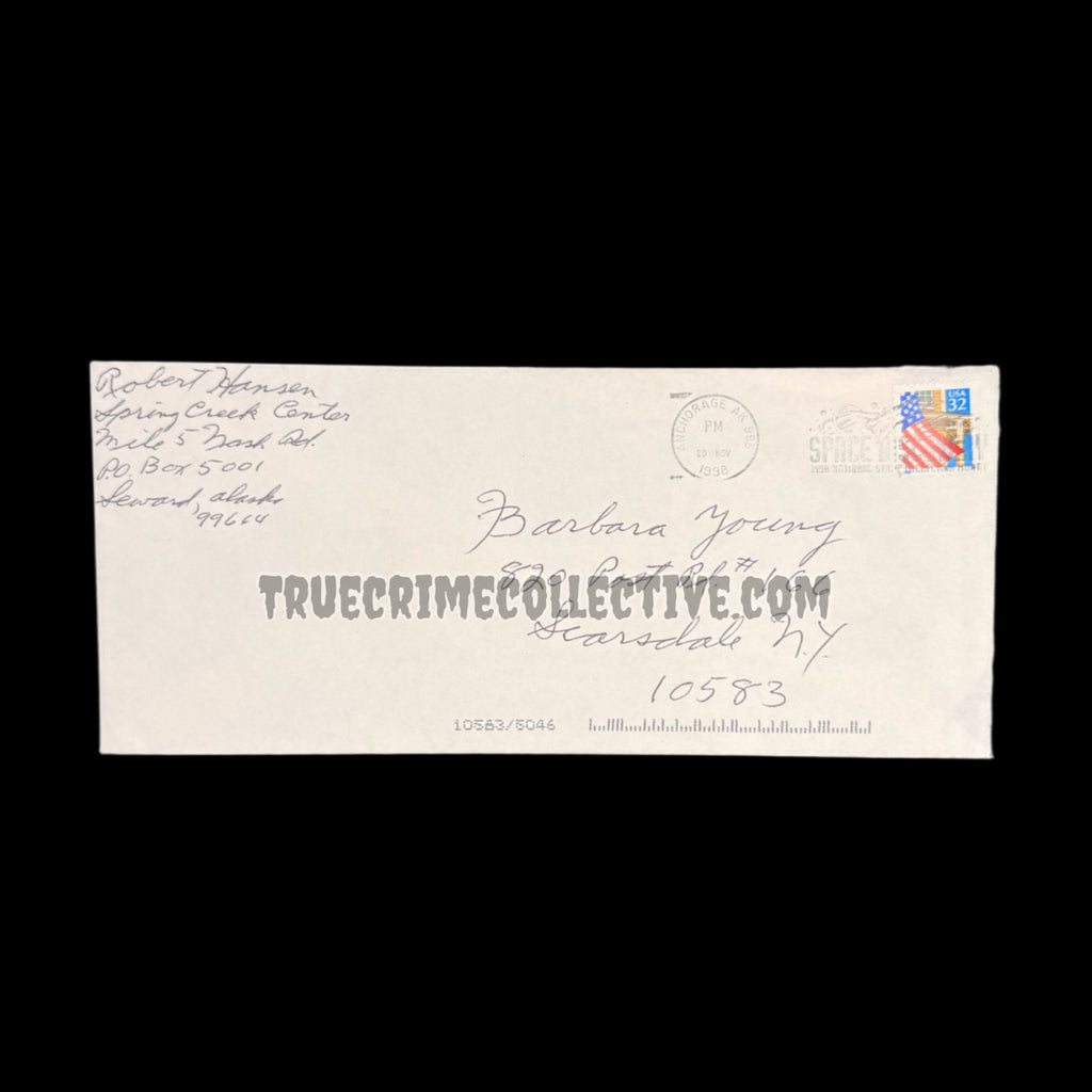 This is an extremely rare letter and envelope set from Alaskan serial killer, Robert Hansen aka the Butcher Baker. Items from Hansen hardly ever hit the market, making them exceptionally rare and valuable! Included is the signed mailing envelope, a two page signed letter which also contains a small drawing that Hansen did.