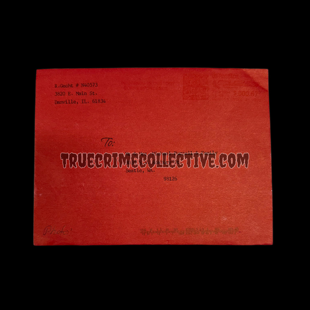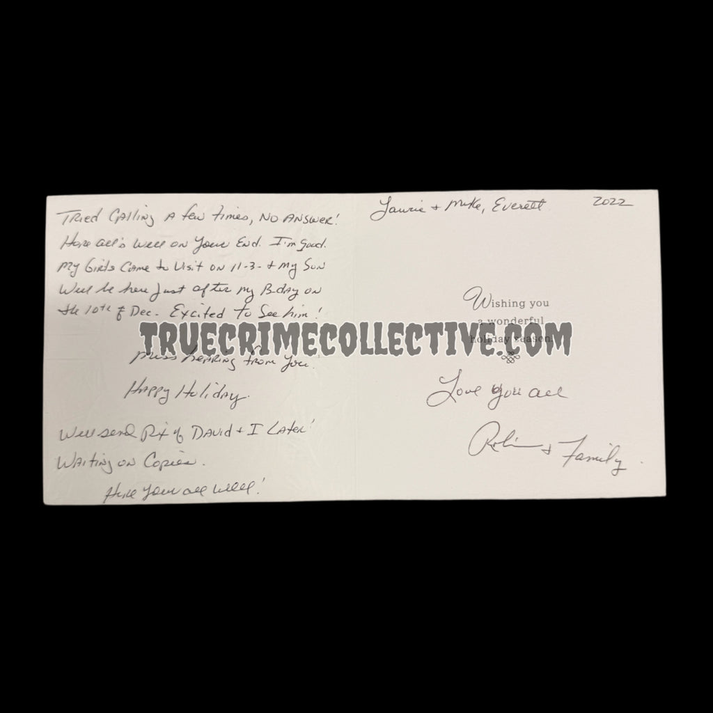 This Christmas card was sent by serial killer Robin Gecht from California Death Row. Included with the card is a photo of Gecht with his family during a prison visit. On the back of the photo, Gecht has listed his family members and signed and dated it.