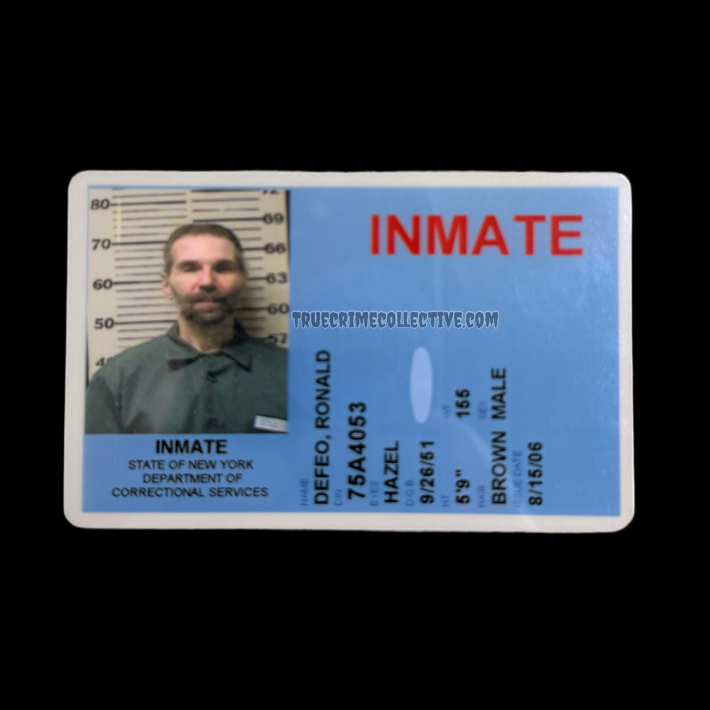 This original New York State Department of Correctional Services inmate identification card belonged to Ronald “Butch” DeFeo Jr., the convicted murderer behind the infamous Amityville house killings. Issued during his incarceration, the card captures DeFeo not as a myth or movie figure—but as an imprisoned killer reduced to numbers, measurements, and state ink.