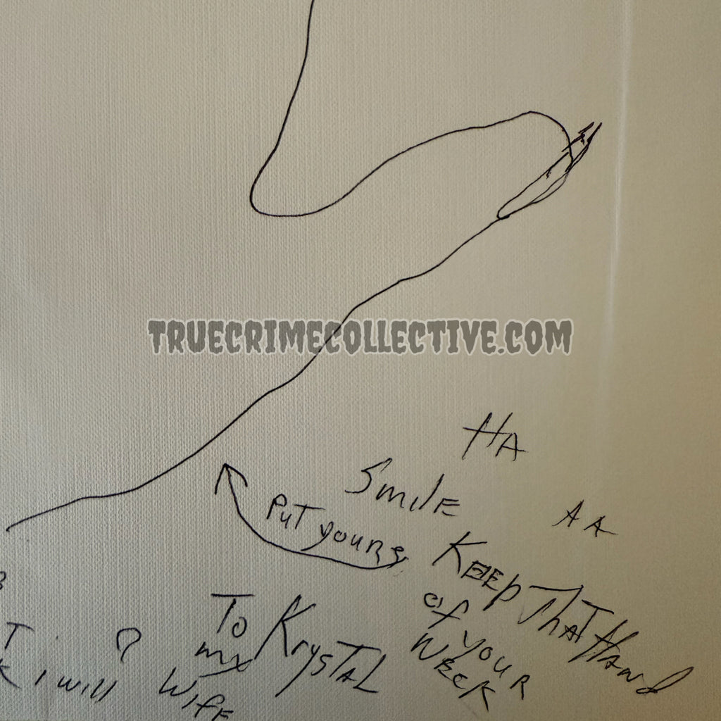 This is an original hand tracing from African American Serial Killer, Samuel Little. Little traced his left hand with pen and signed his full name underneath it, along with a note to his “wife,” Krystal. This was done on a 9x12 inch piece of thick cardstock.