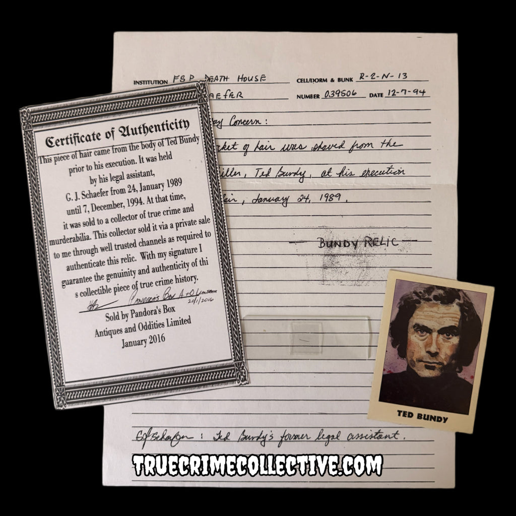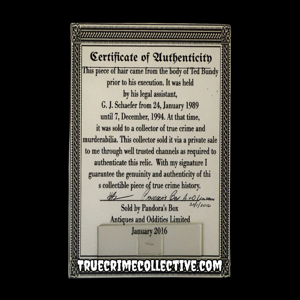 This is a small piece of Ted Bundy’s hair that was collected after he was shaved in preparation for the electric chair on the day of his execution. The small hair is secured on a glass slide. It comes accompanied with a COA from Bundy’s legal assistant, along with a letter of how and when it was obtained. Extremely rare!