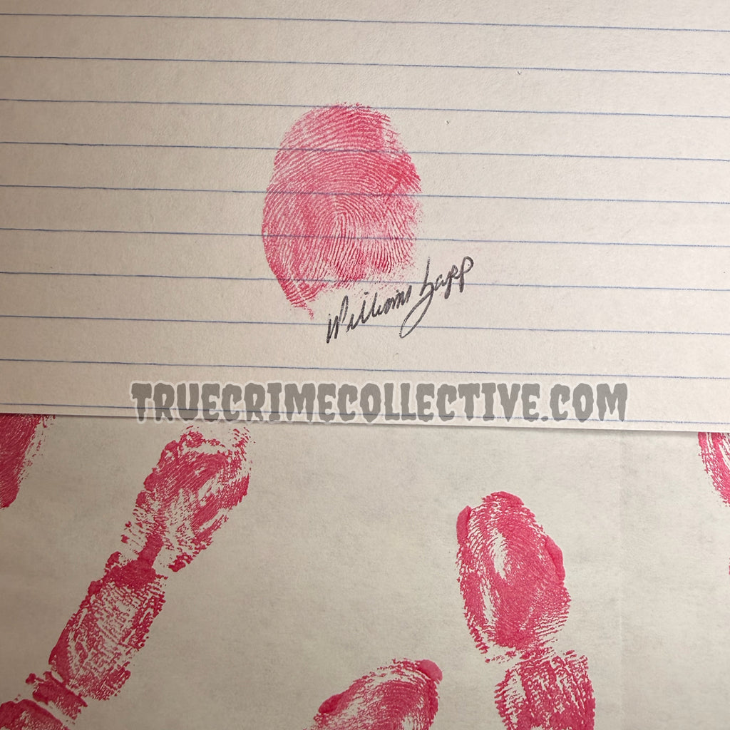 Offered here is a rare and highly unusual set of signed handprints attributed to William Sapp, created using vivid red ink on paper. This striking piece features full left and right hand impressions, capturing intricate palm lines and fingerprint detail, along with an additional signed fingerprint card bearing Sapp’s signature.