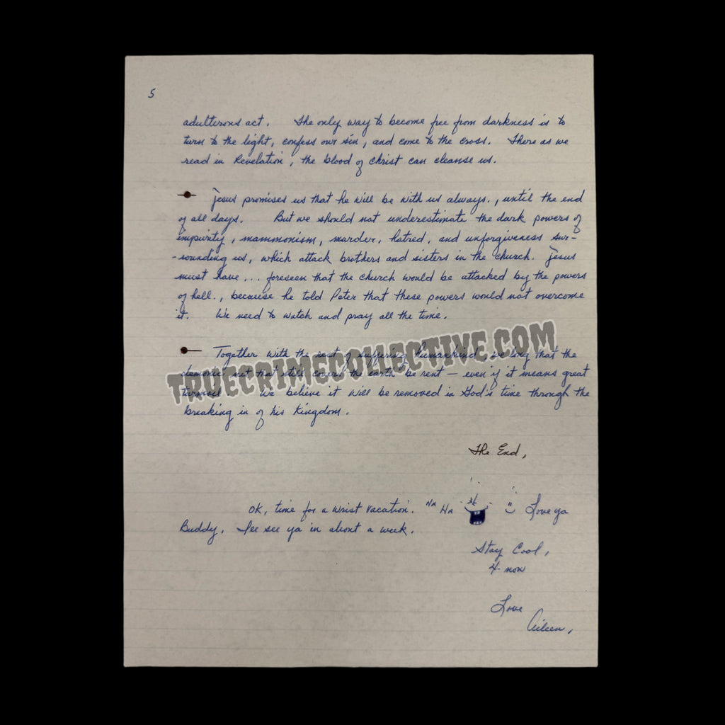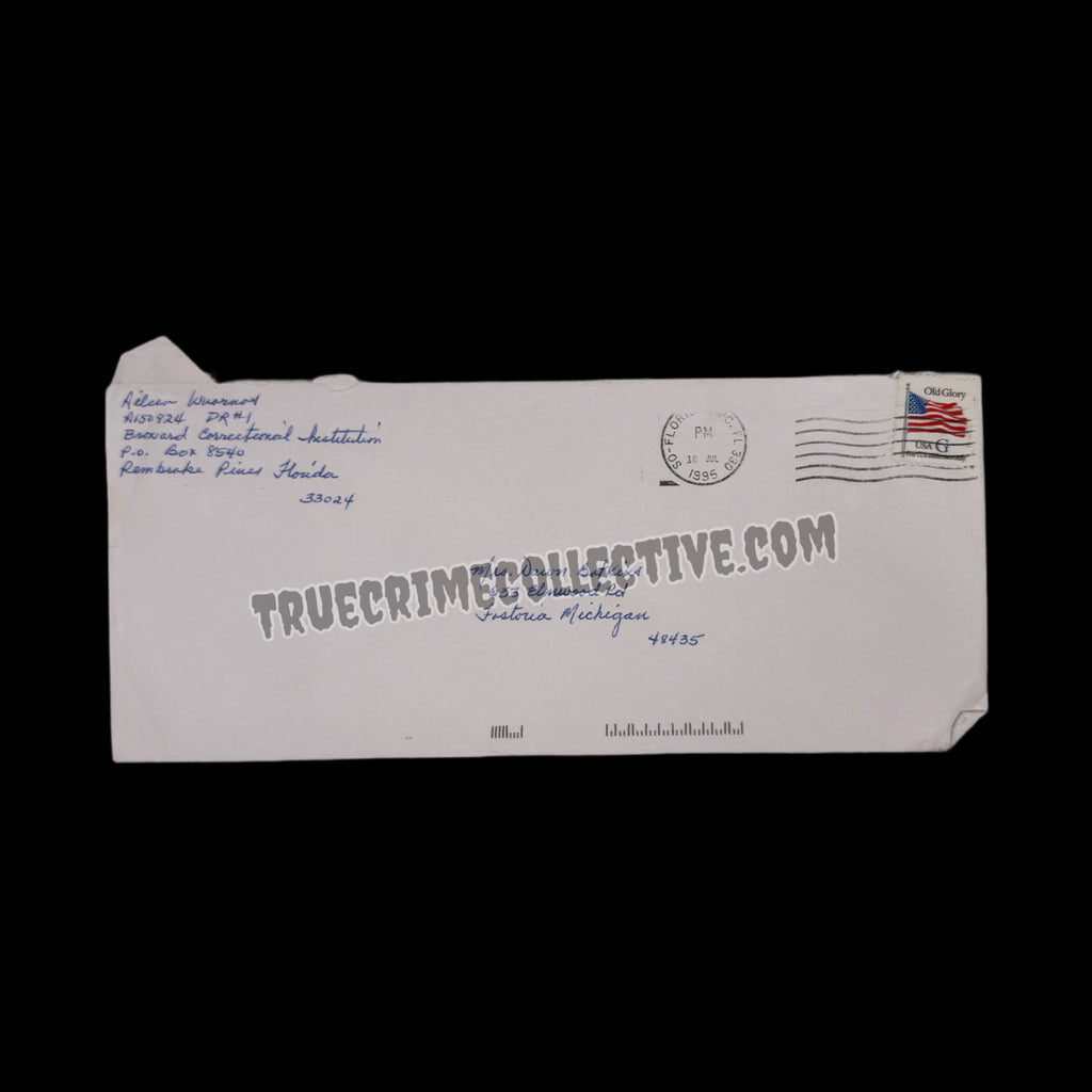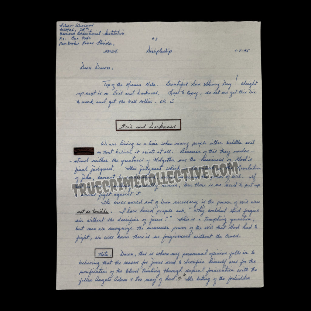 This is a chapter from a book that Aileen Wuornos was writing over her time on death row. The book was never published, but she completed a handful of chapters, all which contained religious writings and life experiences. This chapter of the book was titled “Evil & Darkness” and is a total of five pages long and handwritten by Aileen. She was sending her best friend Dawn all of the writings for her to put together for a book. The letter is signed “Aileen” at the end, and contains her full signature on the mailing envelope and header of page one as well.