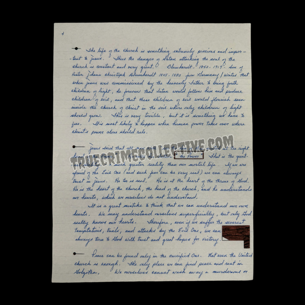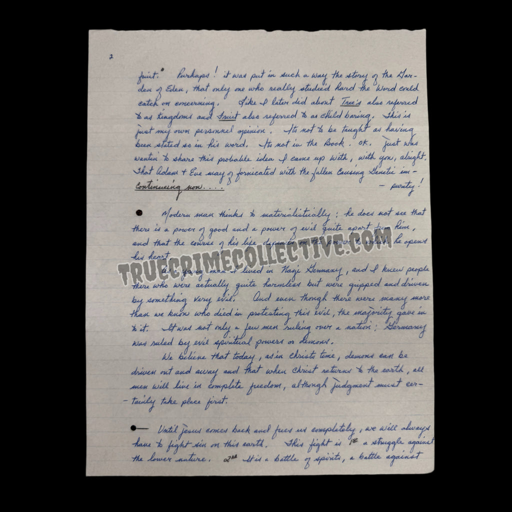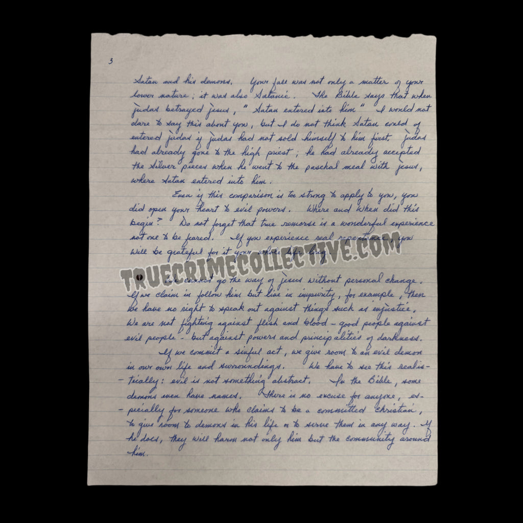This is a chapter from a book that Aileen Wuornos was writing over her time on death row. The book was never published, but she completed a handful of chapters, all which contained religious writings and life experiences. This chapter of the book was titled “Evil & Darkness” and is a total of five pages long and handwritten by Aileen. She was sending her best friend Dawn all of the writings for her to put together for a book. The letter is signed “Aileen” at the end, and contains her full signature on the mailing envelope and header of page one as well.