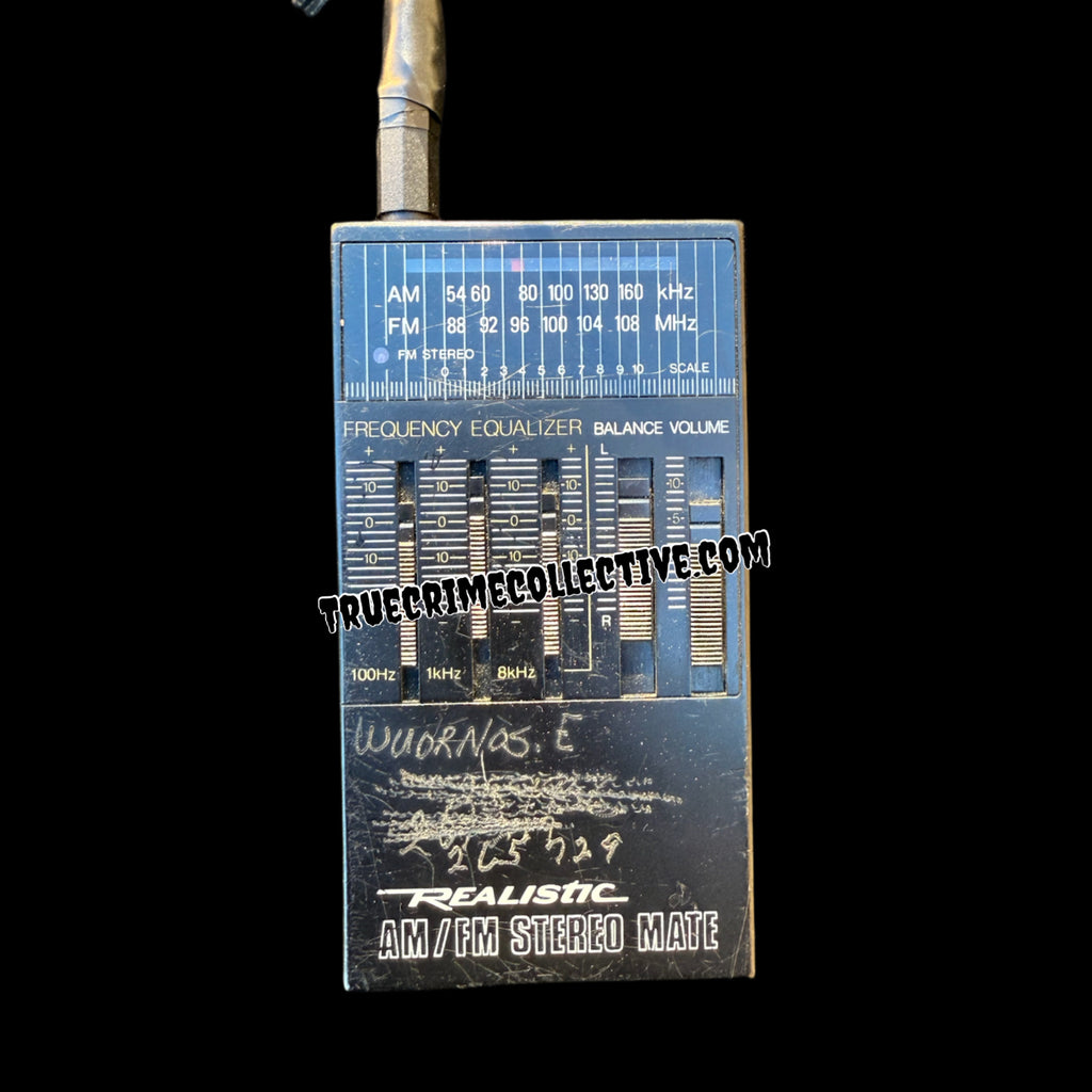 This handheld prison radio and headphones belonged to Aileen Wuornos during her time on Florida’s Death Row. Her name and inmate ID number have been scratched into the plastic on the radio. This radio was sent to Aileen’s best friend Dawn Botkins with a box of Aileen’s personal belongings after she was executed.