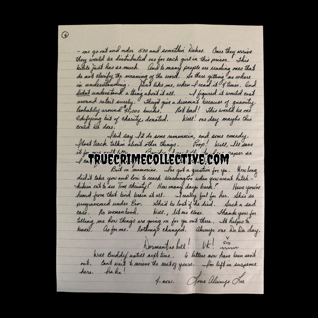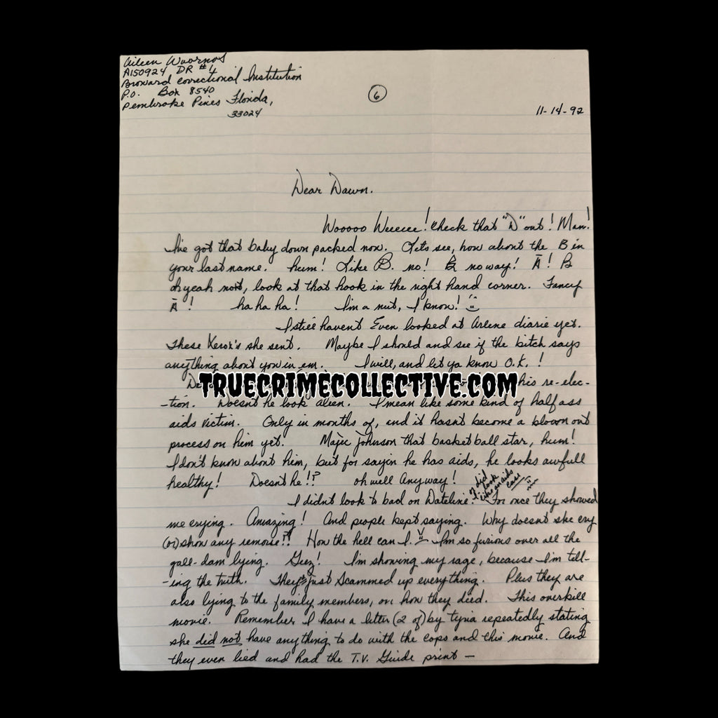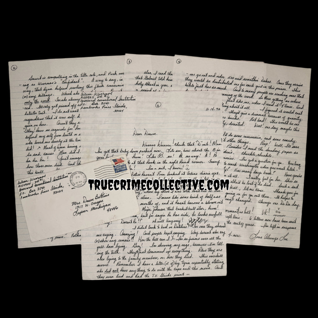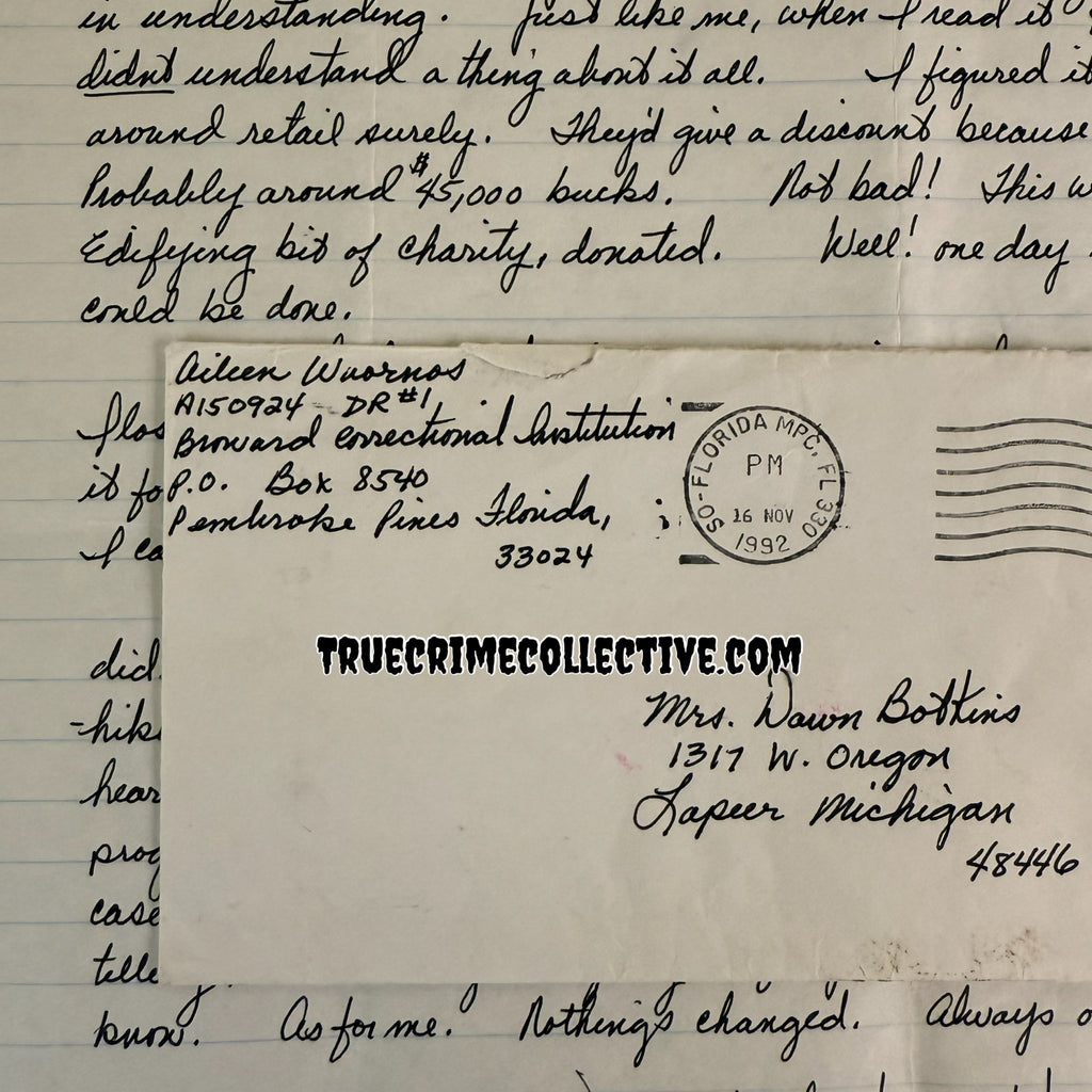 This letter was handwritten by serial killer Aileen Wuornos while on Florida’s death row. The letter was written to Aileen’s best friend Dawn Botkins. Aileen has signed the letter as well as the original envelope that accompanies the letter.