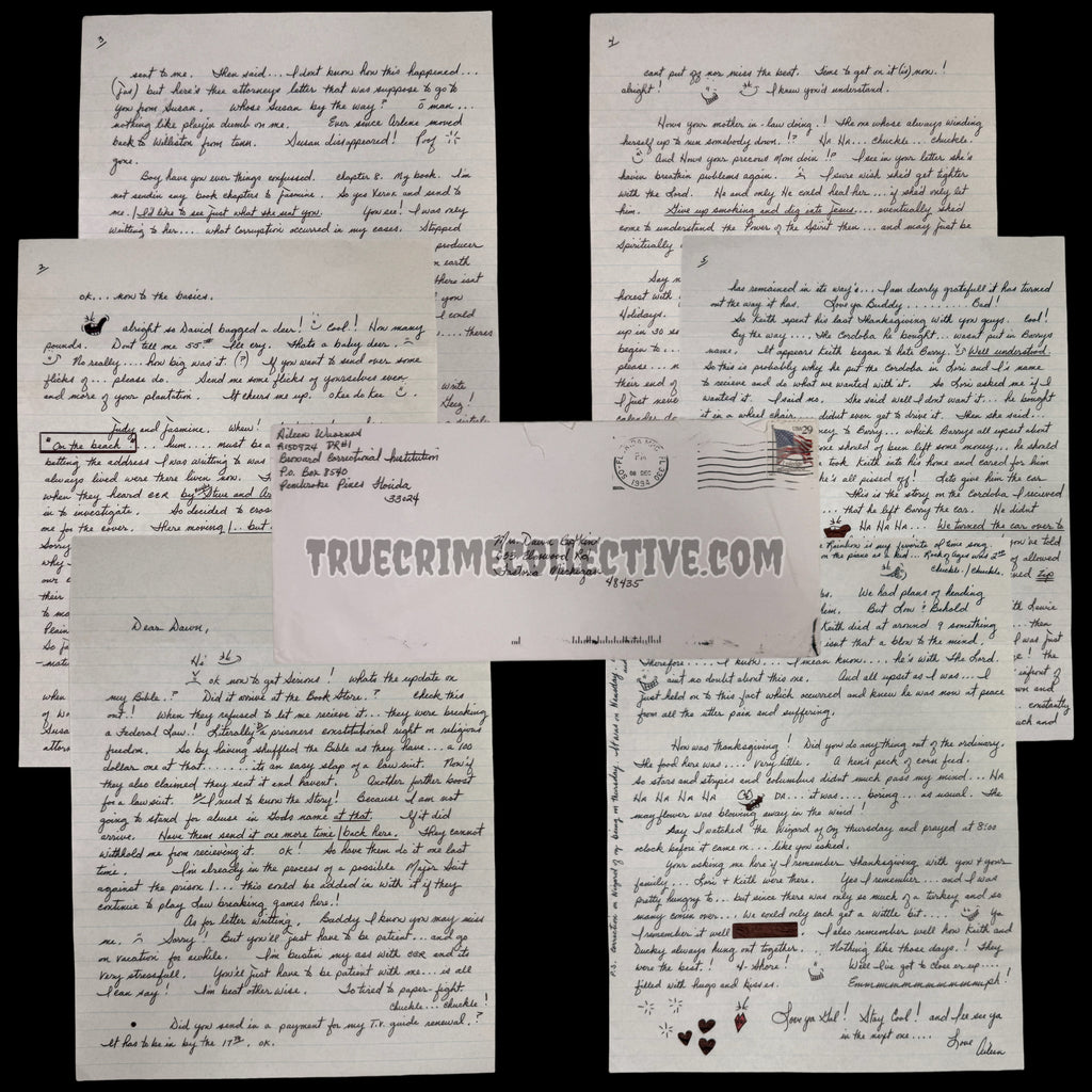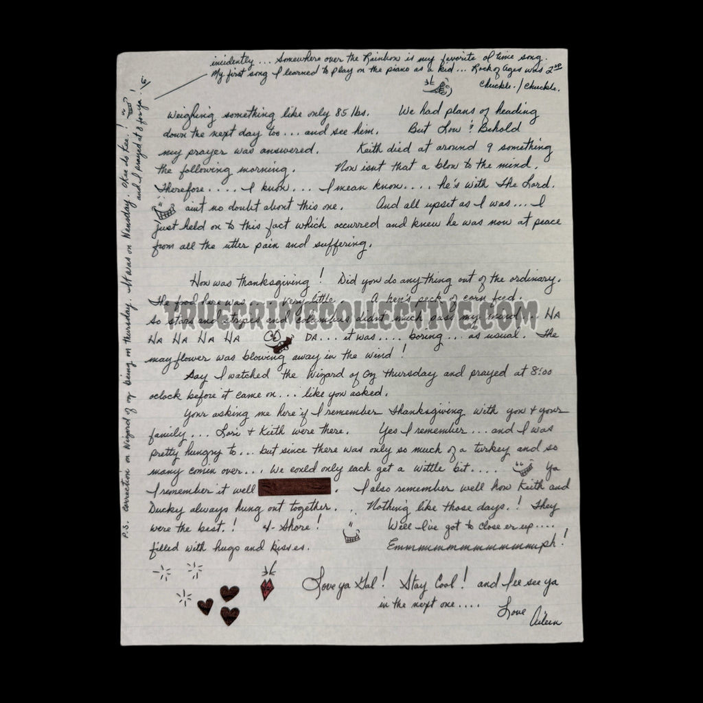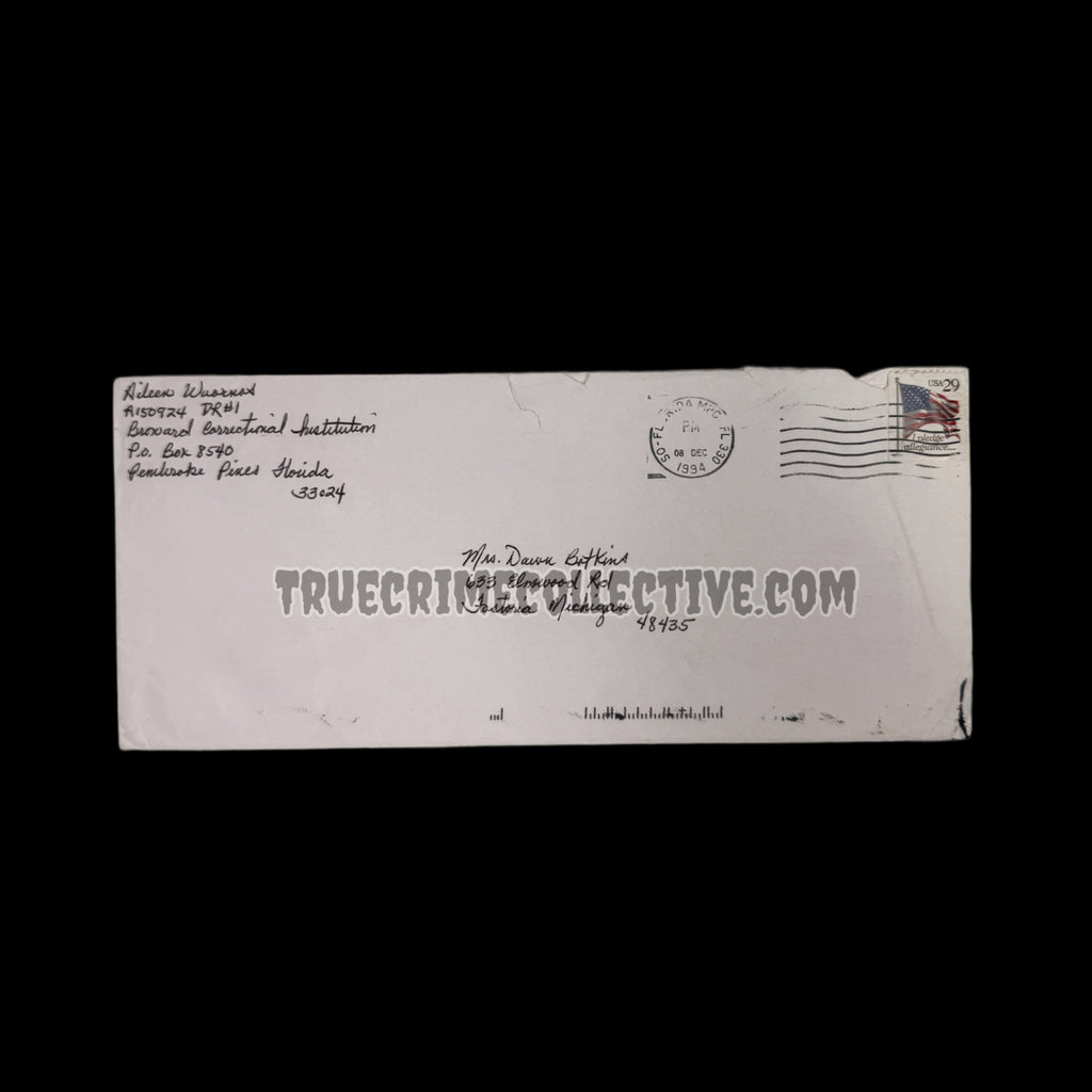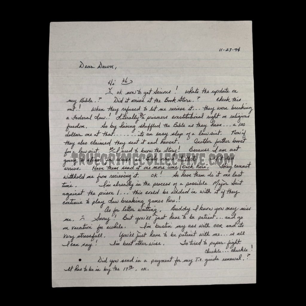 This is a six page long letter from Aileen Wuornos sent to her best friend, Dawn Botkins. In this letter Aileen talks about her bible (the same bible we had for sale with this collection), her adoptive parents, the book she was writing, and more! Very good content throughout this letter. The letter is handwritten by Aileen and has been signed multiple times. Also included is the original mailing envelope which also includes her signature as well.