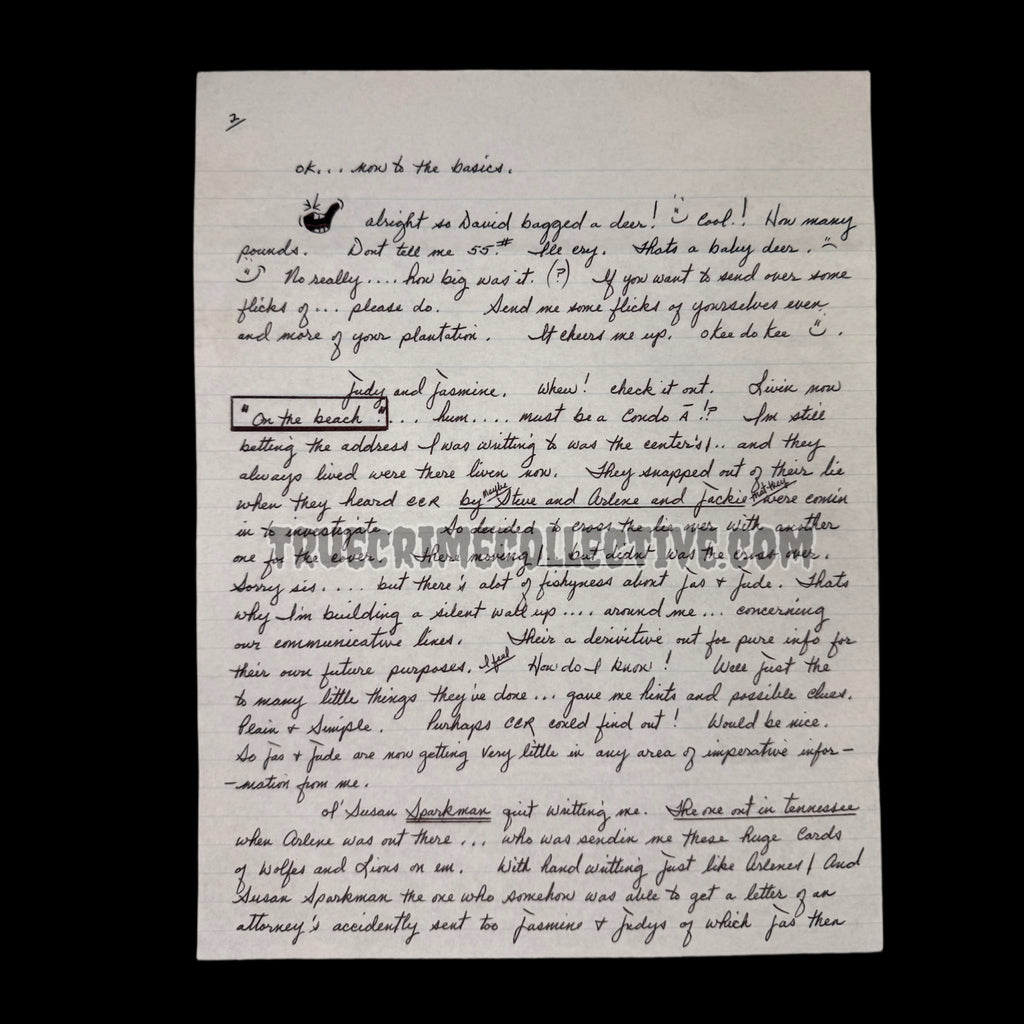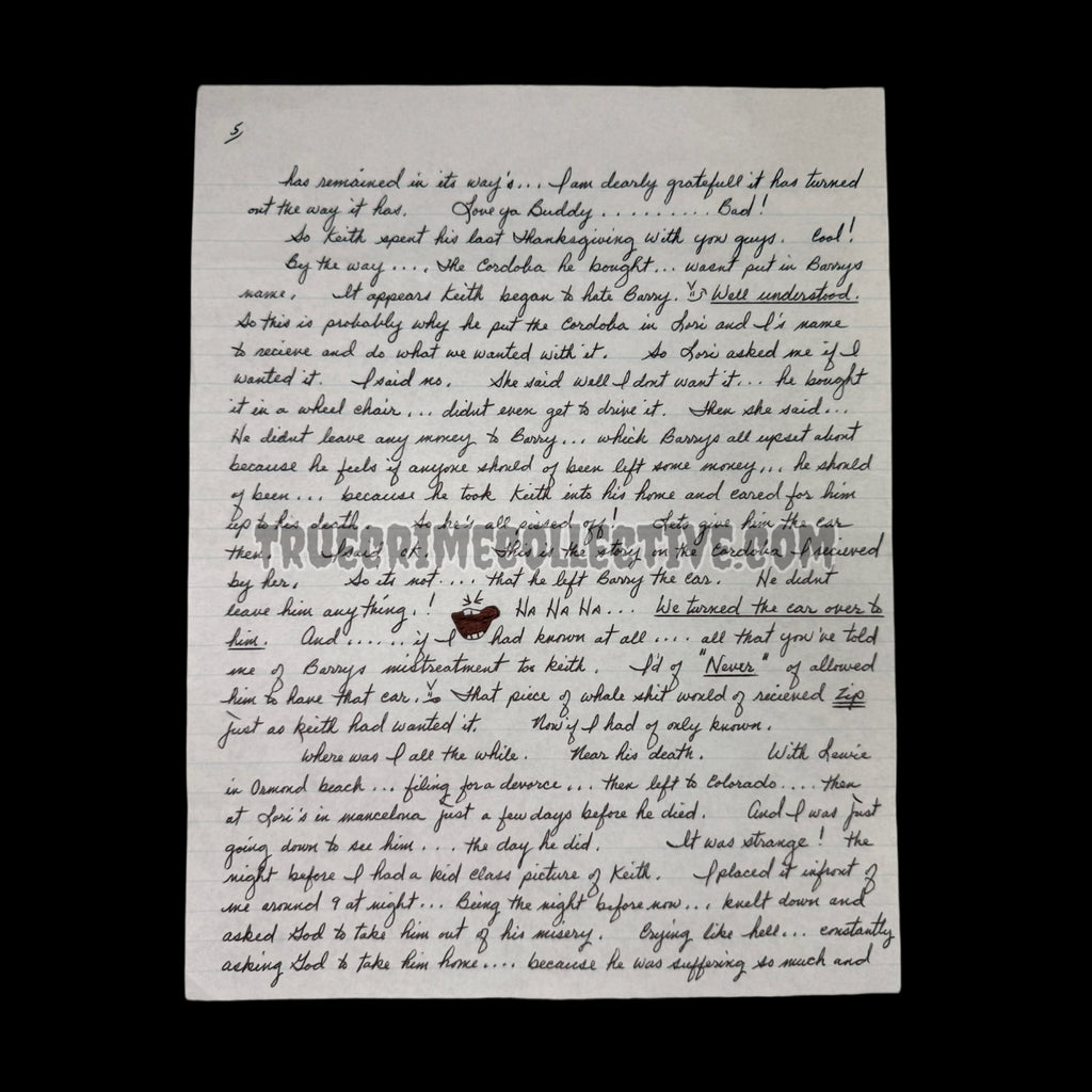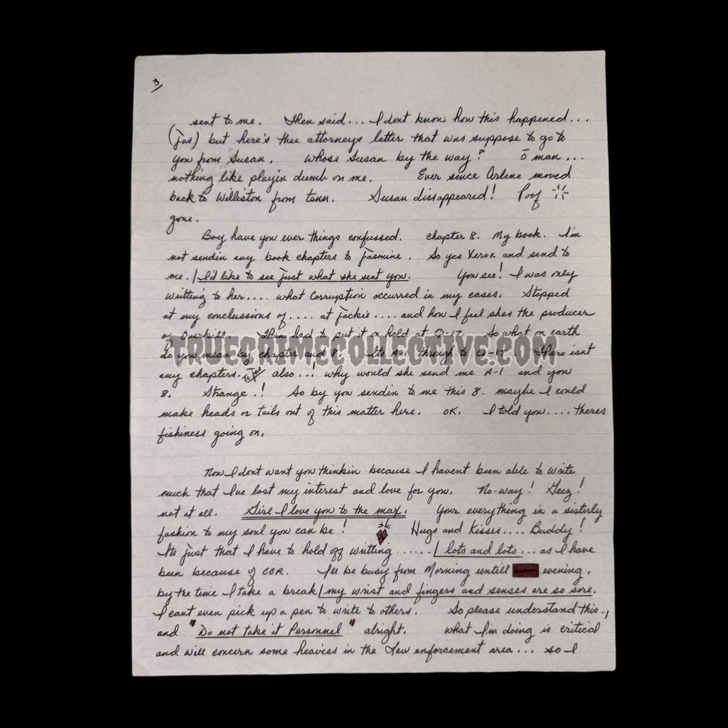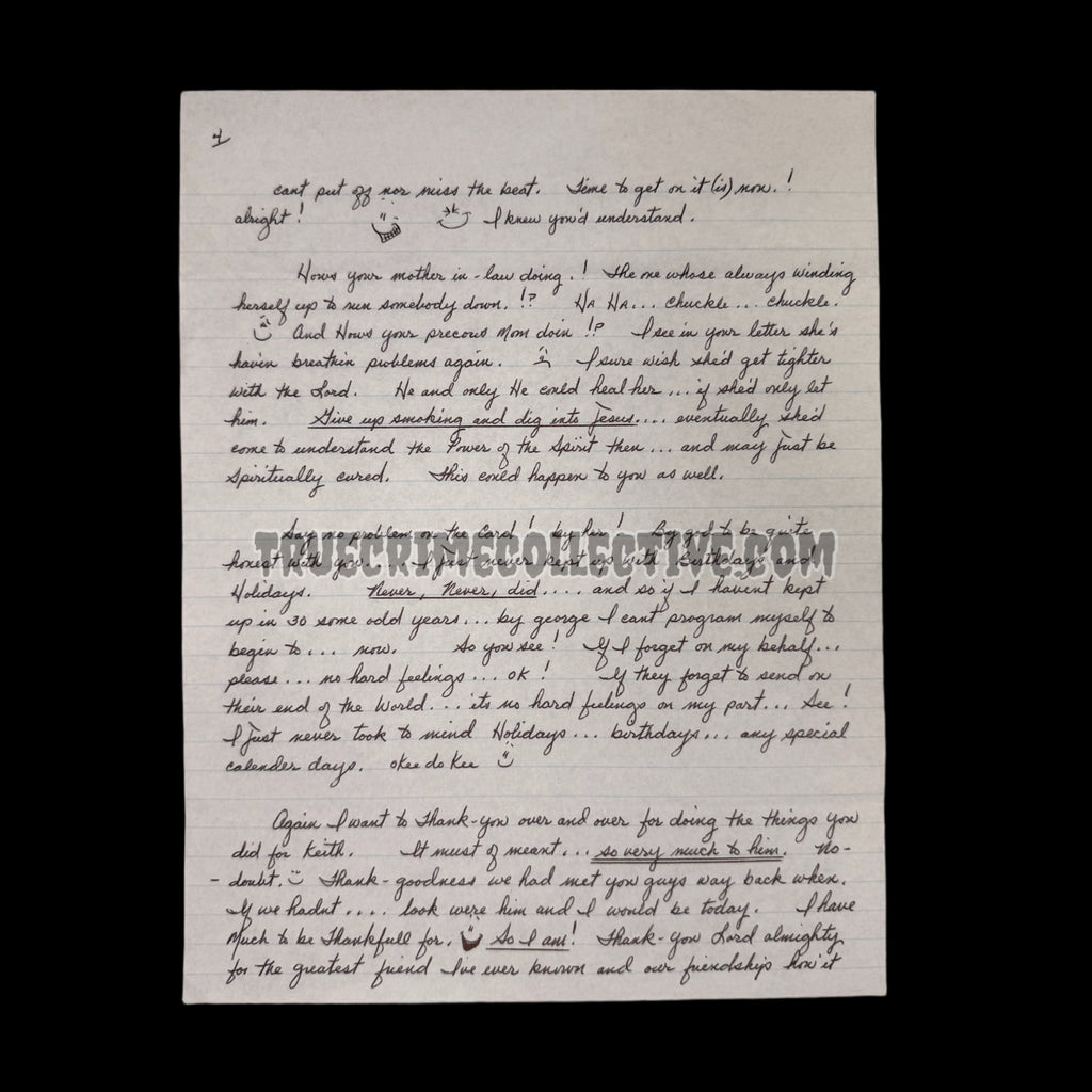 This is a six page long letter from Aileen Wuornos sent to her best friend, Dawn Botkins. In this letter Aileen talks about her bible (the same bible we had for sale with this collection), her adoptive parents, the book she was writing, and more! Very good content throughout this letter. The letter is handwritten by Aileen and has been signed multiple times. Also included is the original mailing envelope which also includes her signature as well.