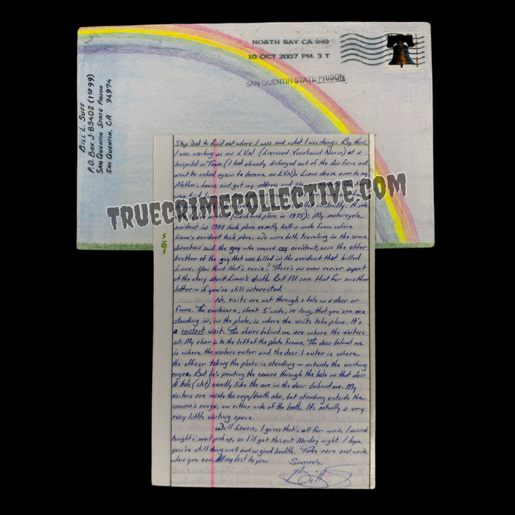 This listing is for a 5 page letter that was sent by California Serial Killer Bill Suff. The letter is 5 pages long, and includes a colored pencil drawing that he did on the mailing envelope.