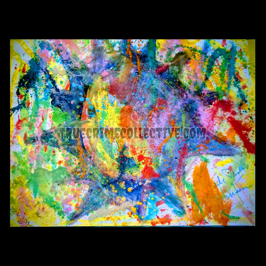 This watercolor painting was done by infamous cult leader Charles Manson. The painting features a sun with lots of thick and colorful paint splatter around it. Manson signed his name in the bottom right hand corner. Painting was done on an 8.5 x 11 inch piece of paper.