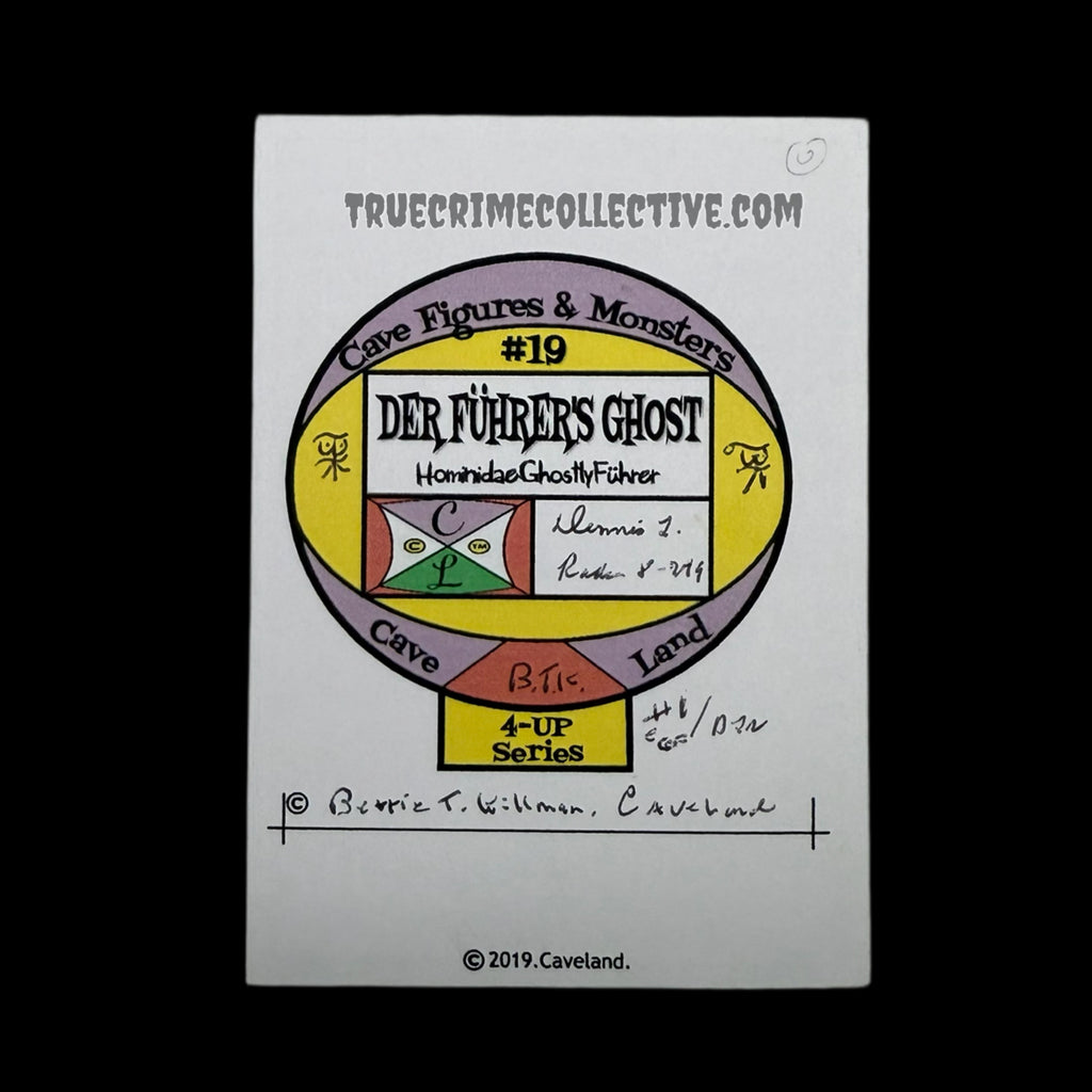 This is a small, colored pencil drawing done by none other than Dennis Rader aka “BTK.” The drawing depicts a cave monster version of Adolf Hitler in Nazi uniform, and he has titled the artwork “Der Führers Ghost.” The front has been hand signed by Rader and includes his rare and infamous BTK symbol. The back side has also been hand signed by Rader. Artwork measures 4x3 inches.