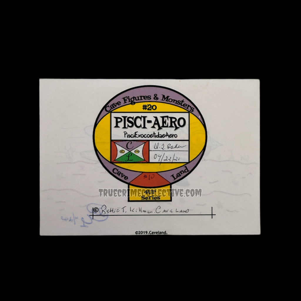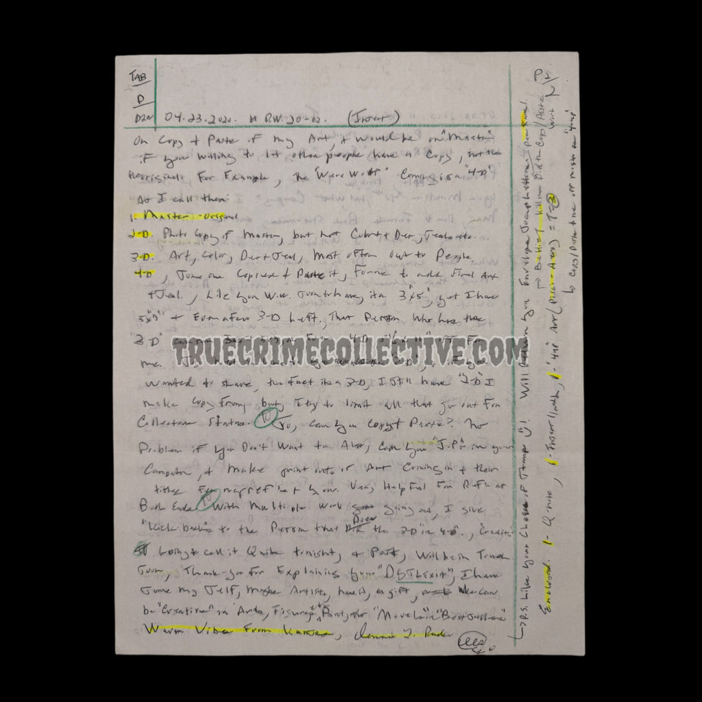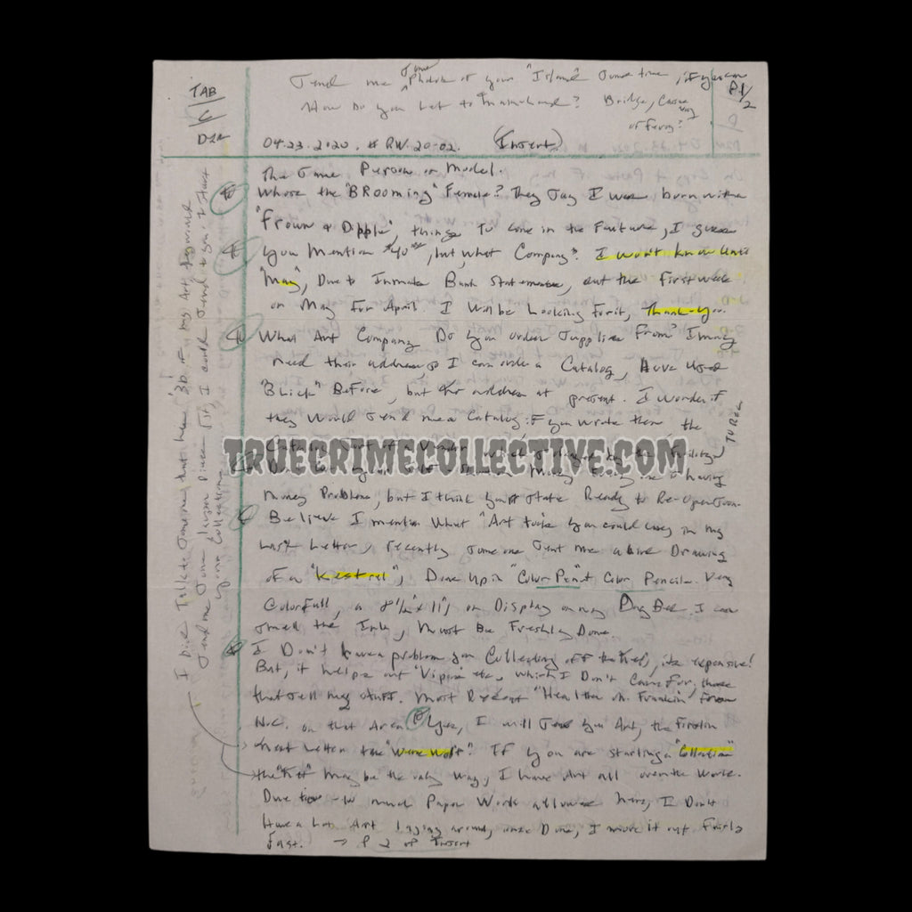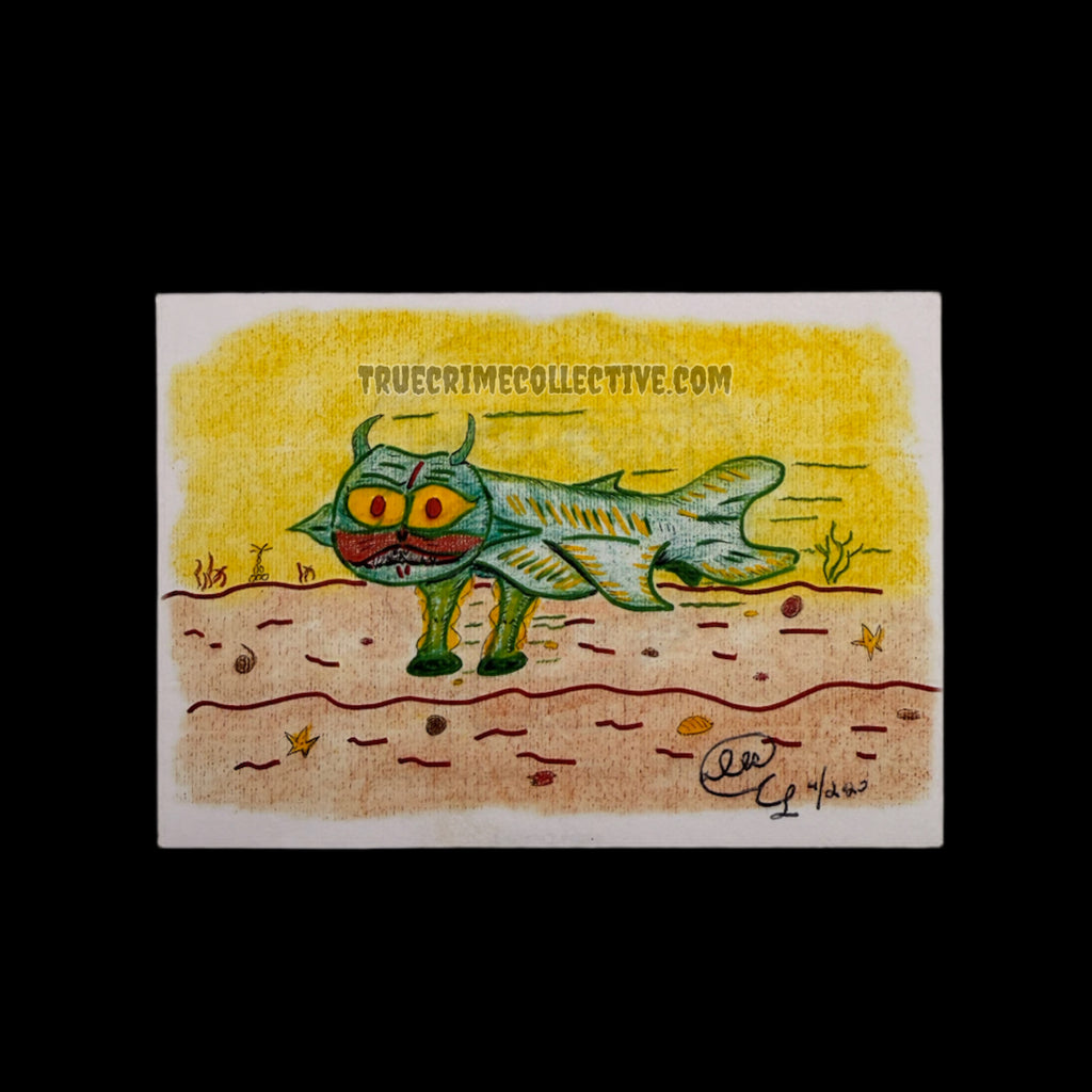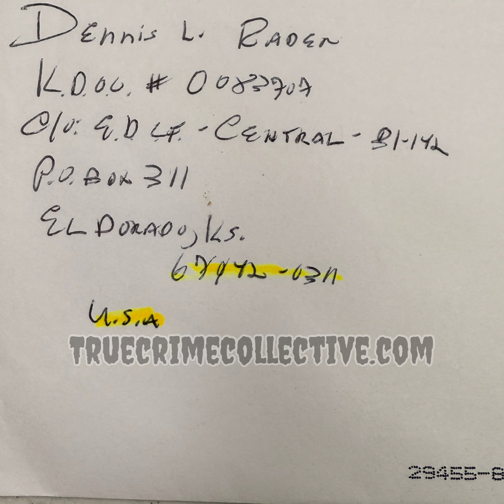 This is a two page, handwritten letter from Dennis Rader aka BTK. Included with this letter is a small drawing of Cave Monster. The drawing has been signed by Rader on the front and the back. This letter also includes the original, signed mailing envelope.