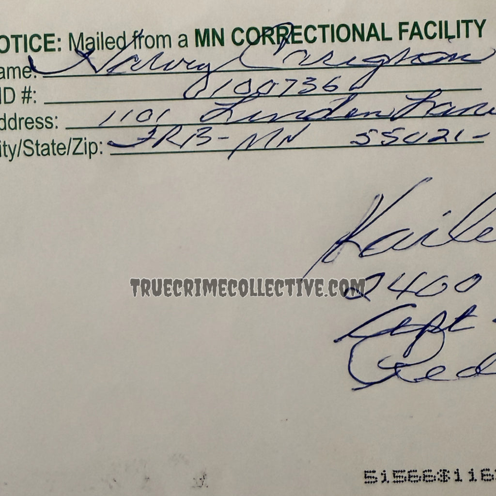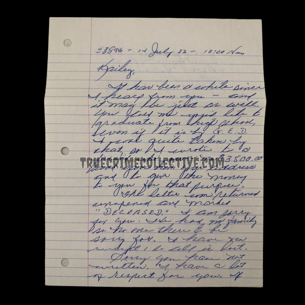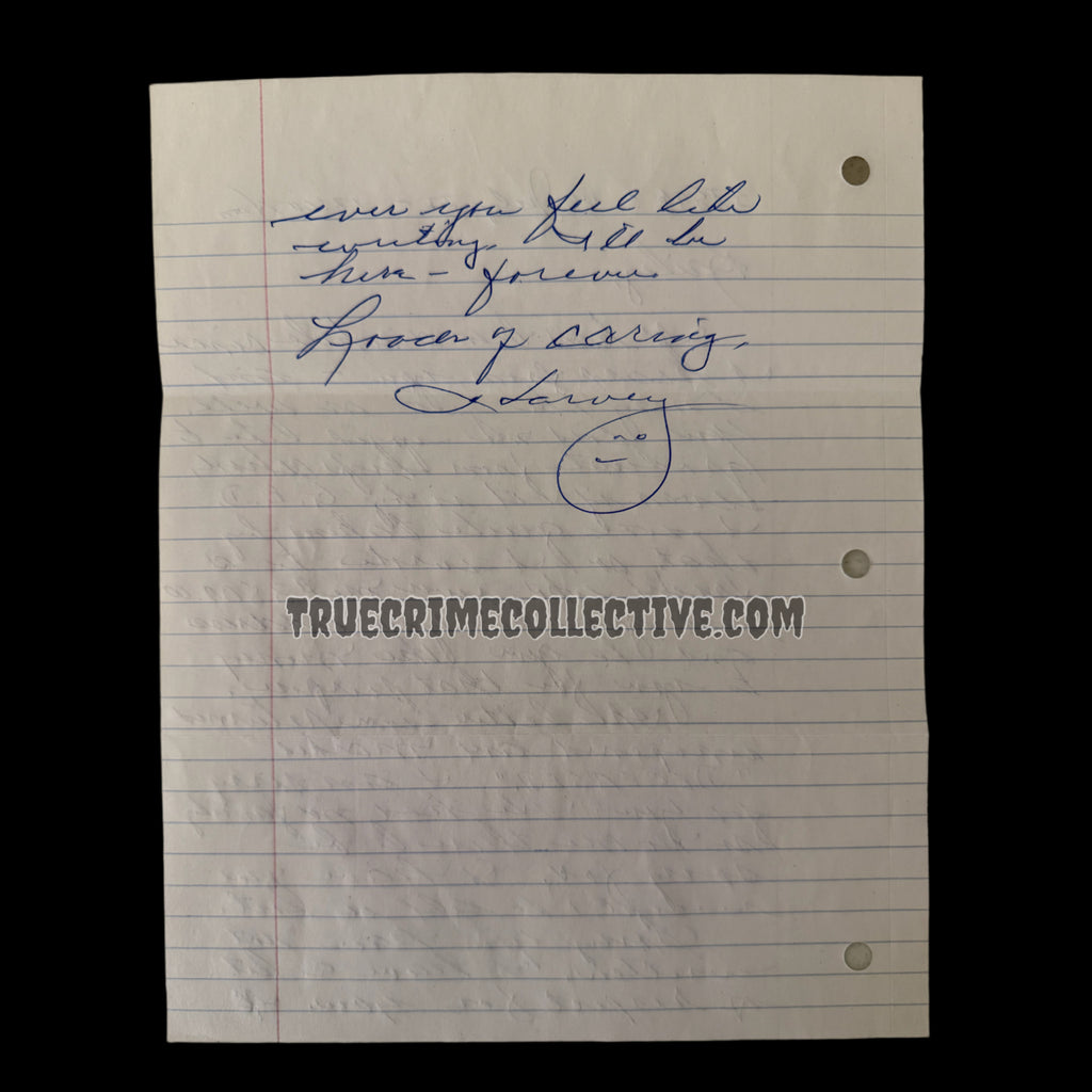 Two page letter and envelope set from serial killer Harvey Carignan, also known as the Want-Ad Killer and Harvey the Hammer. This letter was handwritten front and back of one single page, and signed at the end of the letter on page two. Also included with this letter is a photo that Carignan sent of himself.