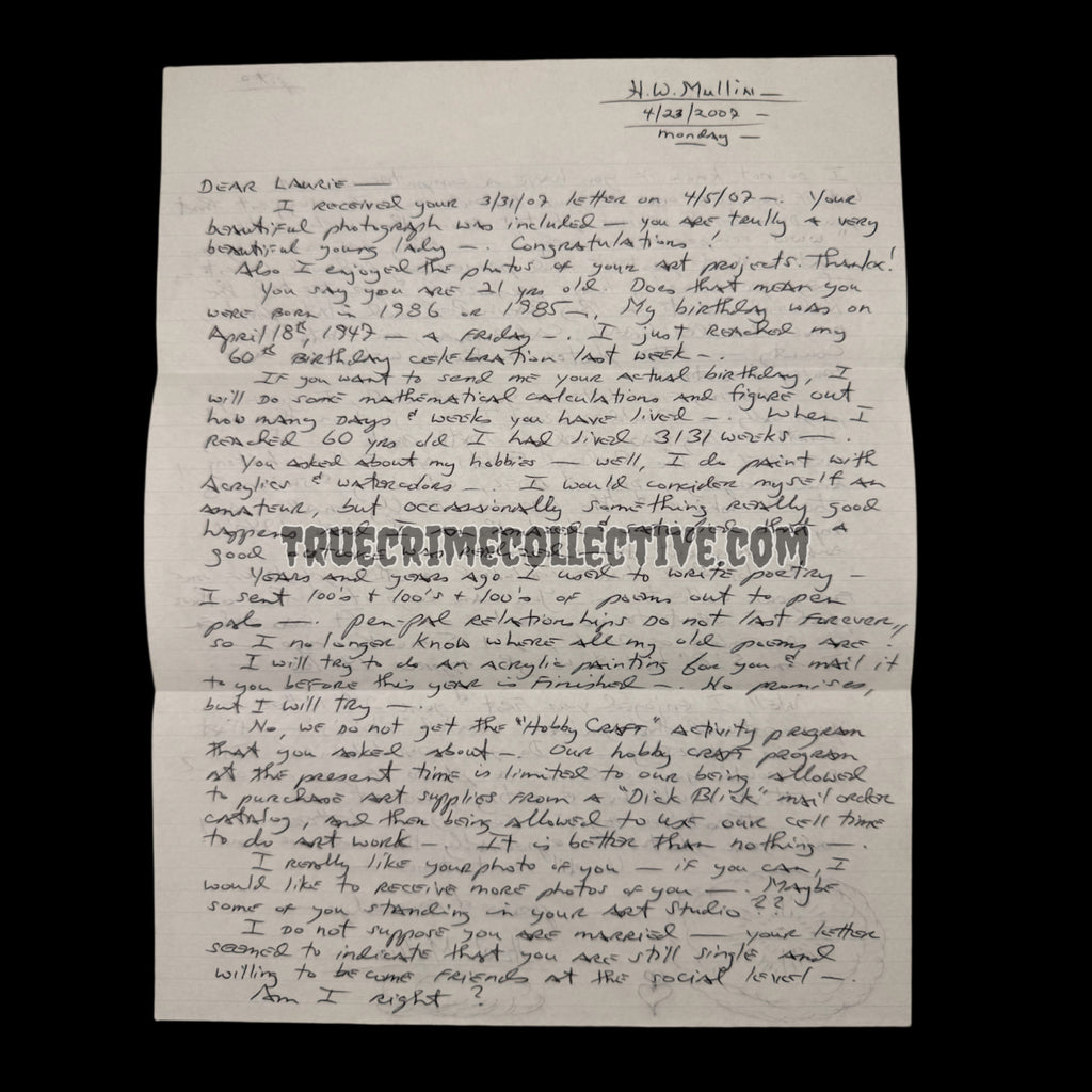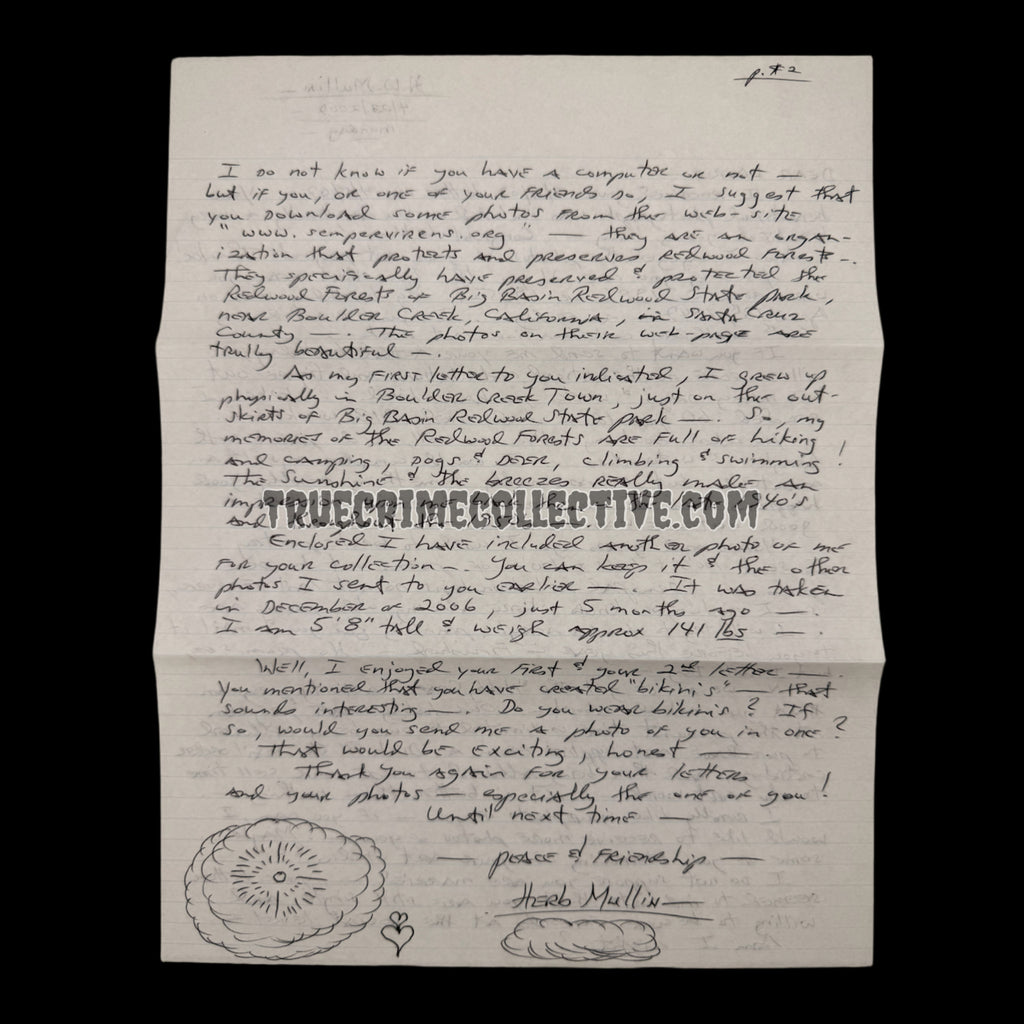 This is a handwritten letter from The Hippy Killer, Herbert Mullin. Along with the signed, two page letter and envelope is a signed photograph that Mullin sent along with the letter! The letter also includes two small drawings that Mullin did at the bottom of page two.