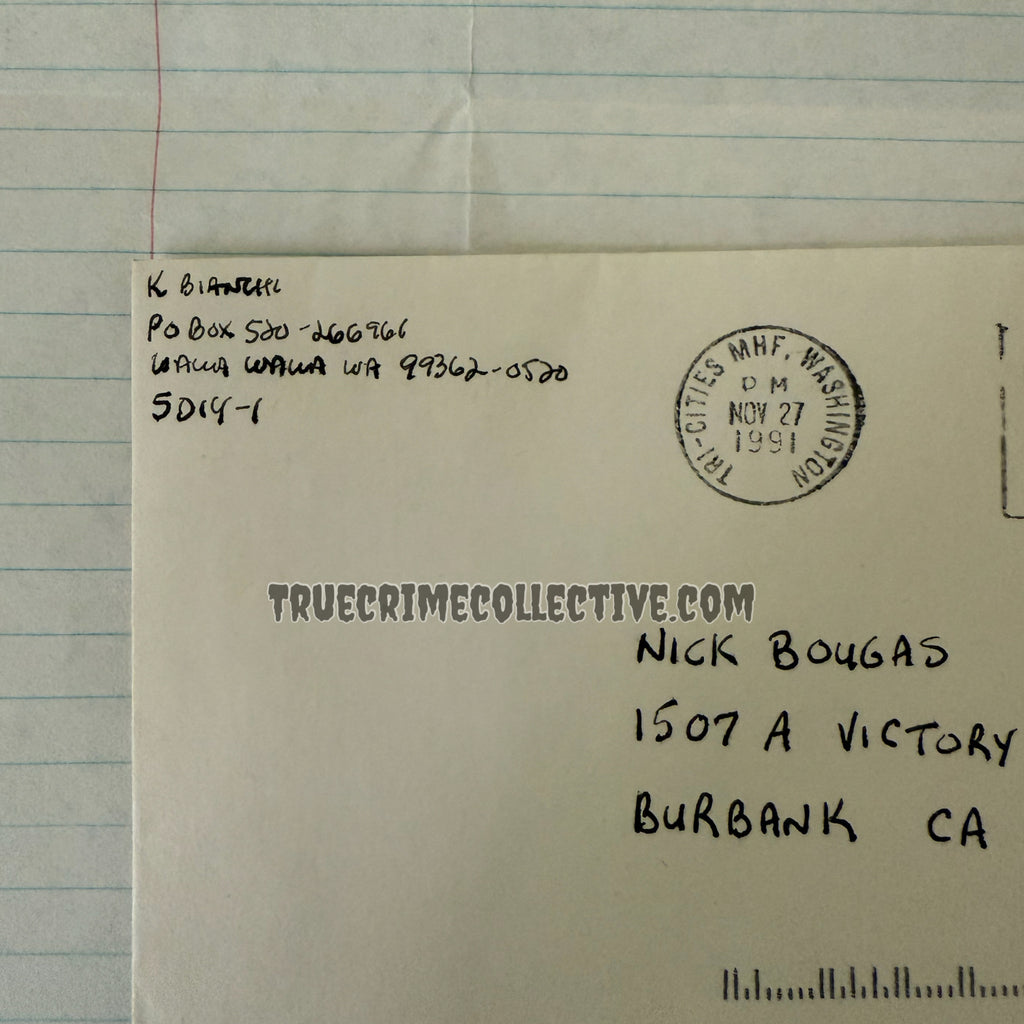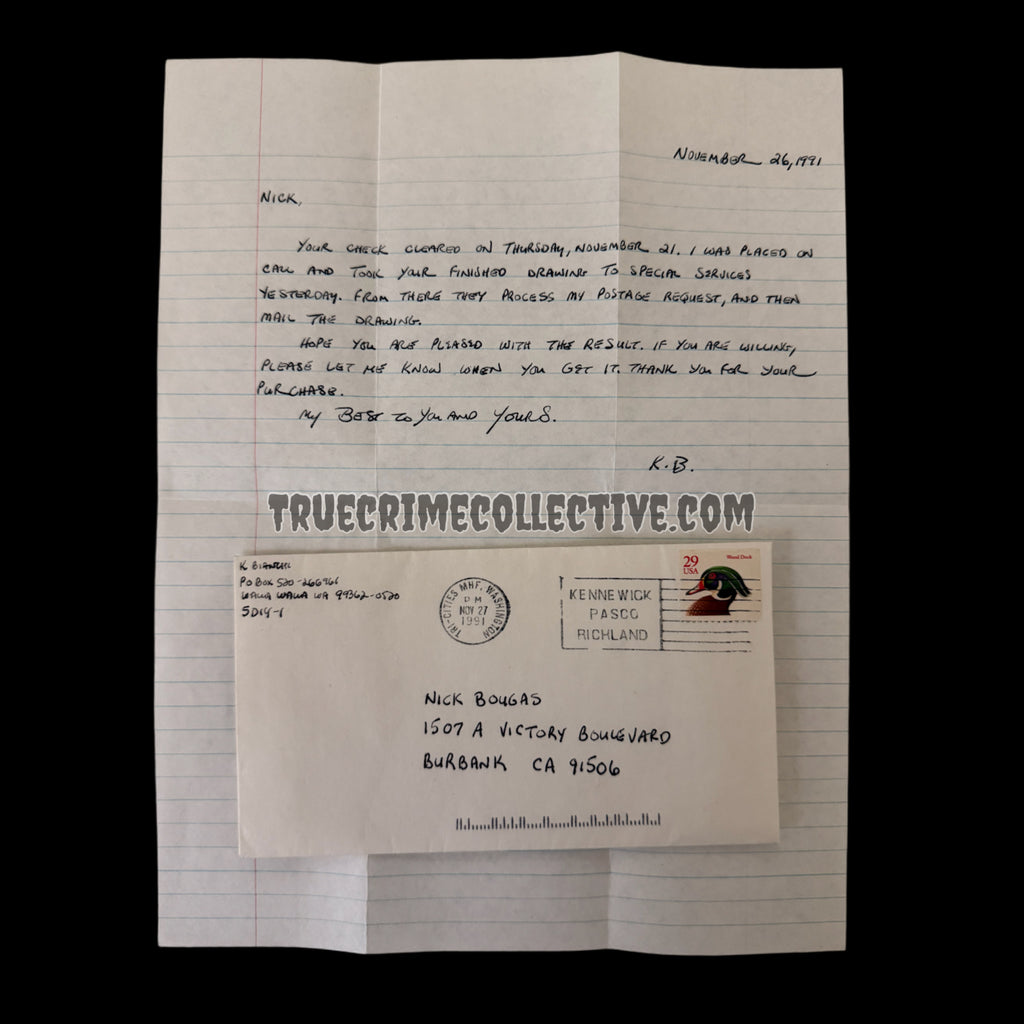 This is a signed letter and envelope set from Kenneth Bianchi, sent to infamous true crime collector, Nick Bougas! The letter is one page long, and signed “K.B.” The envelope has been signed “K. Bianchi”