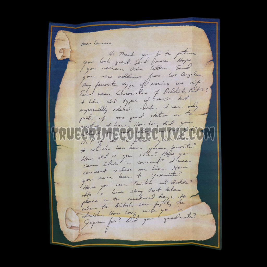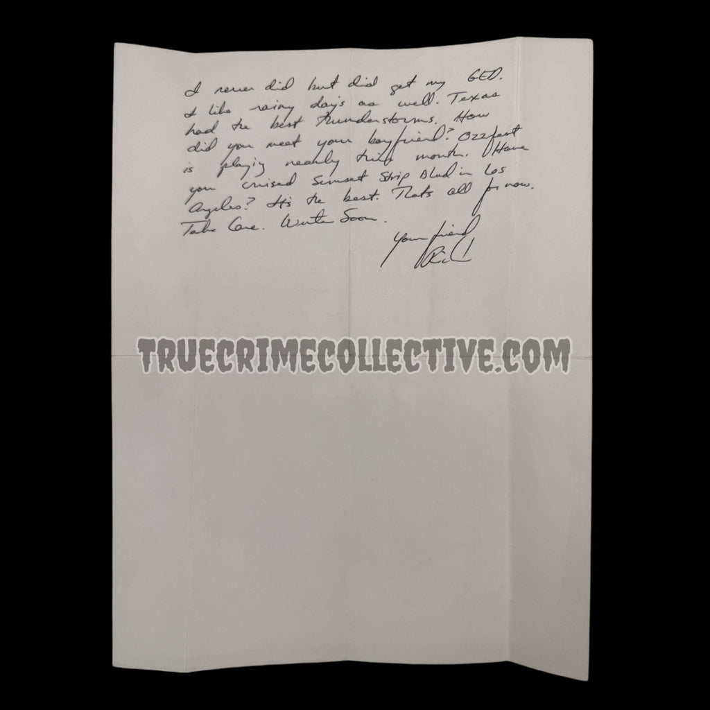 This is a handwritten letter from Richard Ramirez the Night Stalker. Along with this signed letter is the original mailing envelope which also includes Richard’s full signature. One unique thing about this letter is that its written in cursive, which Ramirez did not do very often!