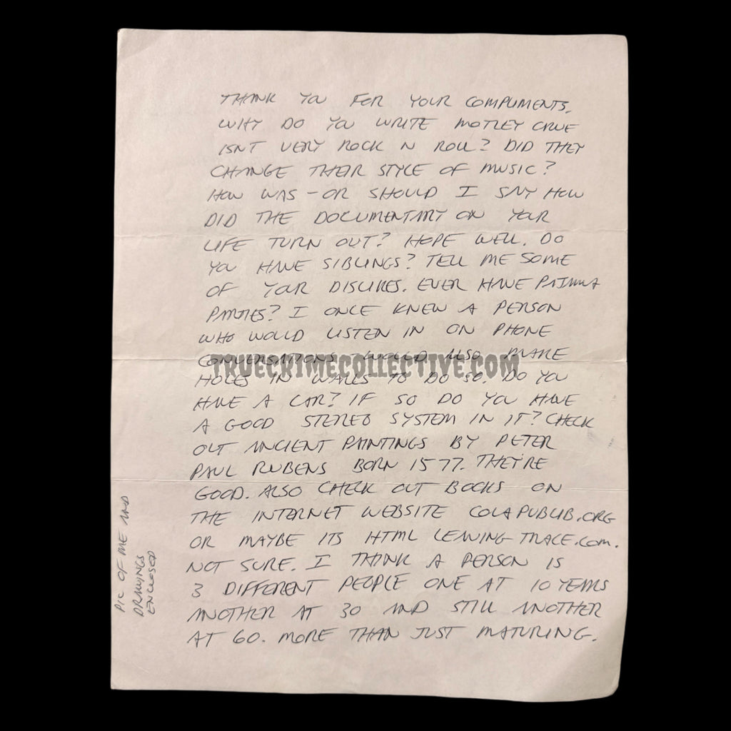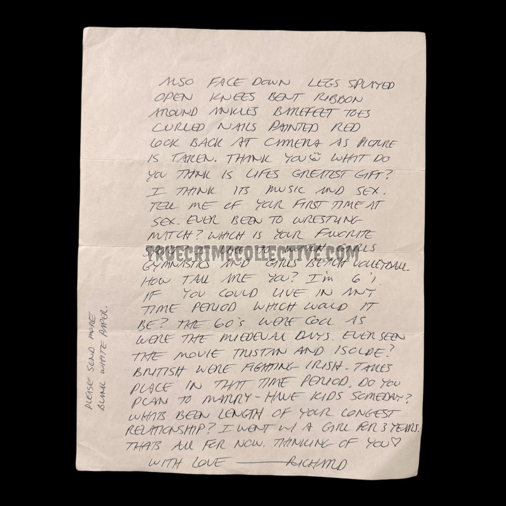 Known as the “Night Stalker,” Ramirez was convicted in connection with a series of highly publicized crimes in California during the 1980s. During his incarceration, he maintained written communication with select correspondents, and surviving examples of complete letters with original mailing envelopes remain highly sought after within established true crime and criminal history collecting circles.