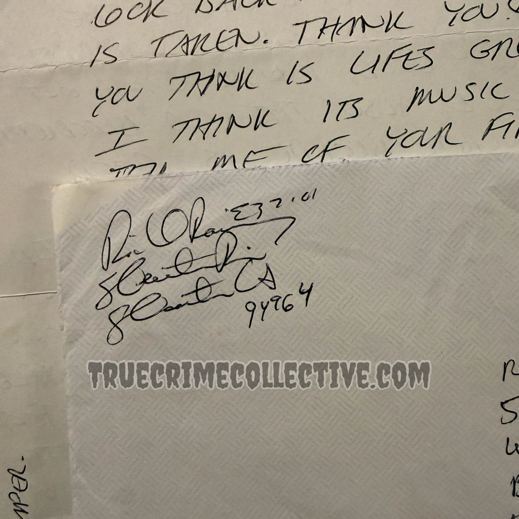 The letter is handwritten entirely in Ramirez’s hand, offering direct insight into his tone, phrasing, and personality during incarceration. The accompanying envelope bears his signature and institutional mailing details, adding historical authenticity and collector value. Together, the letter and envelope form a complete archival pairing, preserving both content and original transmission context.
