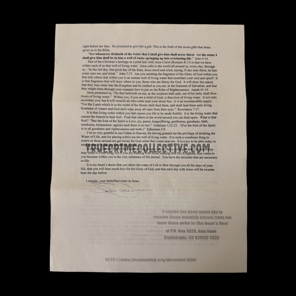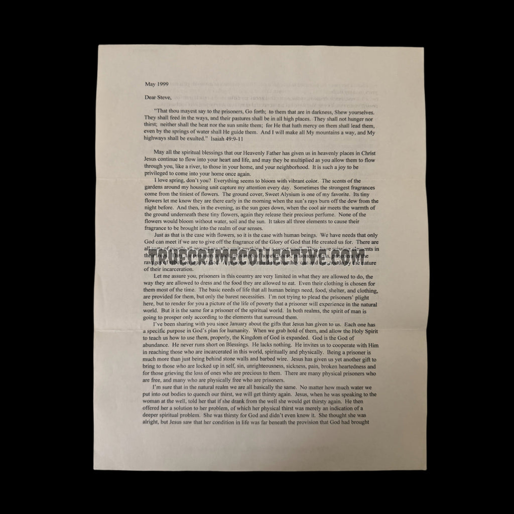 Two page (front and back) typed letter written by Manson Family member, Susan Atkins. Atkins was complicit in both the Sharon Tate and LaBiancha Murders that took place in 1969. It has been believed for many years that Atkins delivered the final blow that ended Sharon Tate’s life.