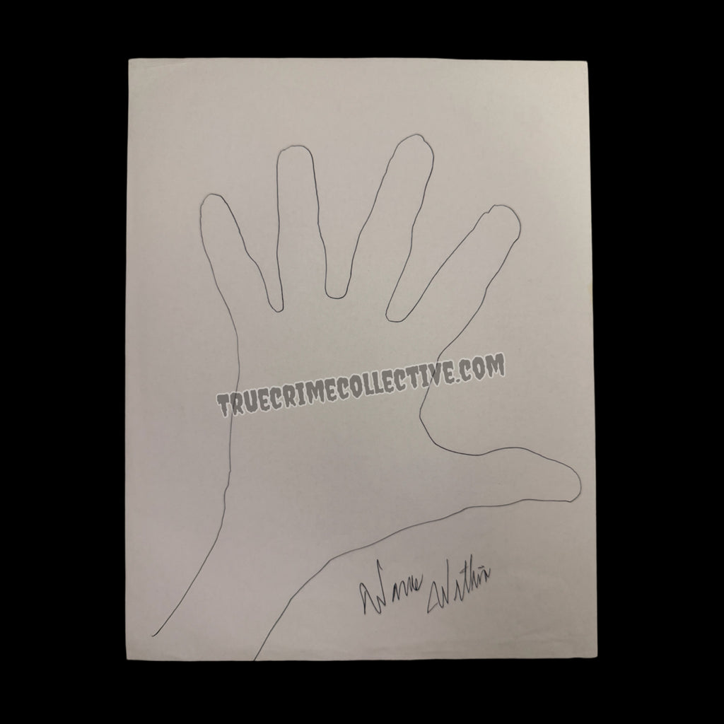 This is a signed hand tracing from convicted murderer, Wayne Williams. The tracing was done using pen, on a standard 8.5x11 inch sheet of white paper. Williams has signed his full name under the hand print.